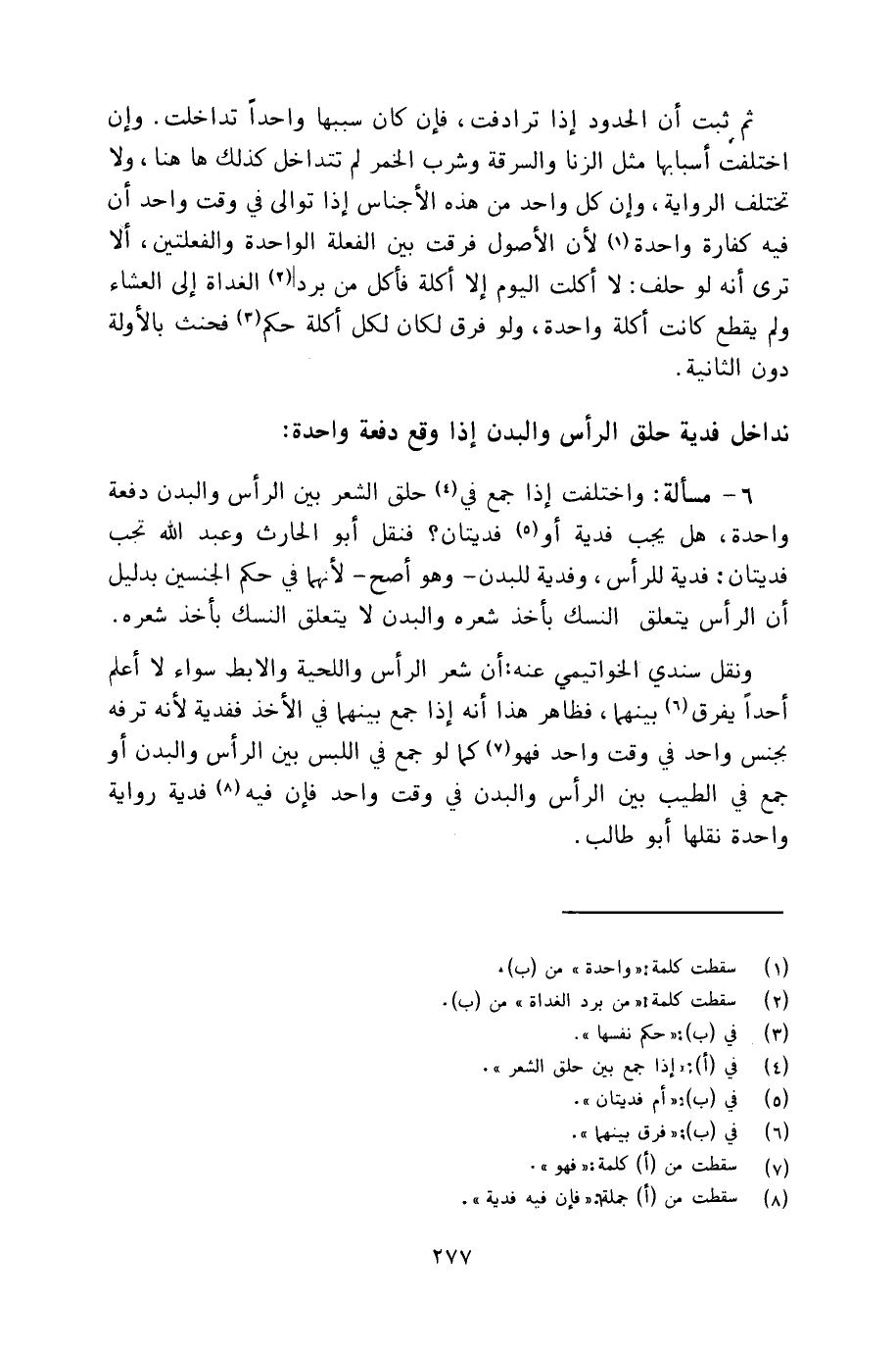 6 - مسألة: واختلفت إذا جمع في حلق الشعر بين الرأس والبدن دفعة واحدة، هل يجب فدية أو فديتان؟ فنقل أبو الحارث وعبد الله تجب فديتان: فدية للرأس، وفدية للبدن ـ وهو أصح ـ لأنهما في حكم الجنسين بدليل أن الرأس يتعلق النسك بأخذ شعره والبدن لا يتعلق النسك بأخذ شعره.