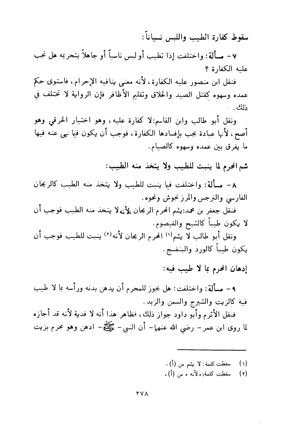 7 - مسألة: واختلفت إذا تطيب أو لبس ناسياً أو جاهلاً بتحريمه هل تجب عليه الكفارة؟