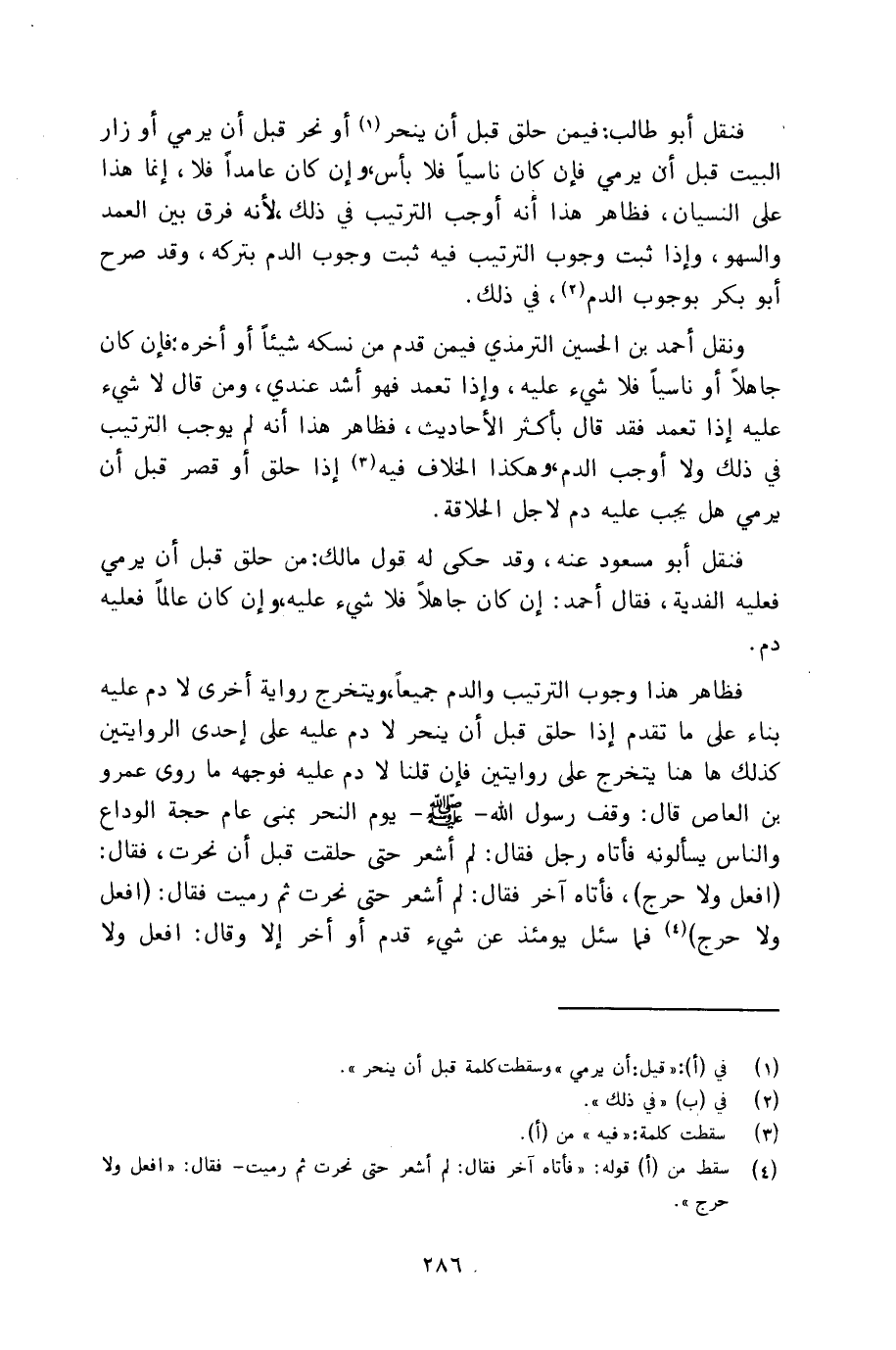ونقل أحمد بن الحسين الترمذي فيمن قدم من نسكه شيئاً أو أخره: فإن كان جاهلاً أو ناسياً فلا شيء عليه، وإذا تعمد فهو أشد عندي، ومن قال لا شيء عليه إذا تعمد فقد قال بأكثر الأحاديث، فظاهر هذا أنه لم يوجب الترتيب في ذلك ولا أوجب الدم، وهكذا الخلاف فيه إذا حلق أو قصر قبل أن يرمي هل يجب عليه دم لأجل الحلاقة.