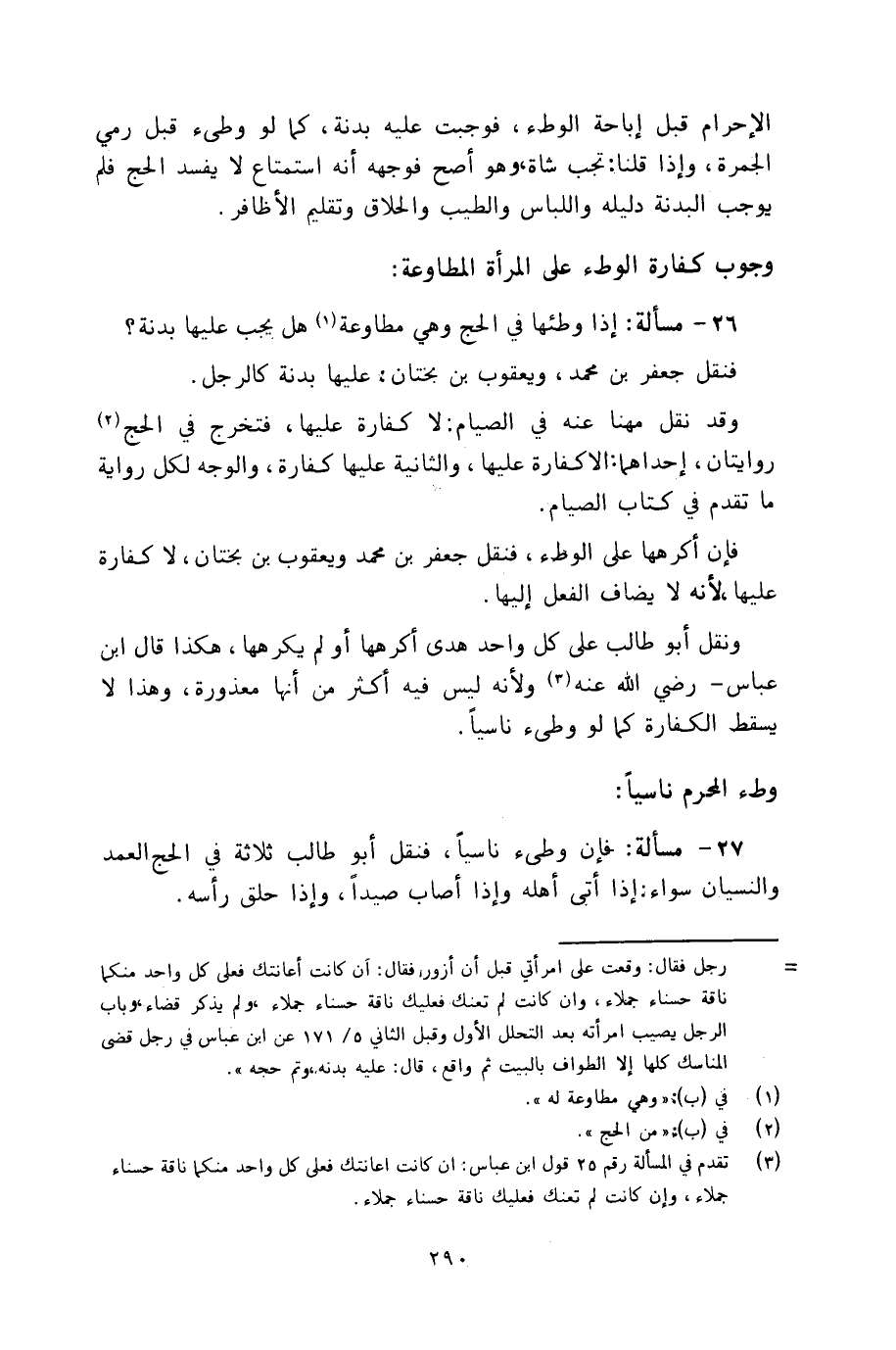 27 - مسألة: فإن وطىء ناسياً، فنقل أبو طالب ثلاثة في الحج العمد والنسيان سواء: إذا أتى أهله وإذا أصاب صيداً، وإذا حلق رأسه.