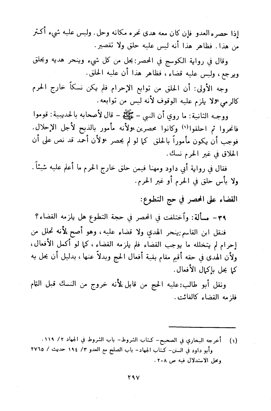 39 - مسألة: واختلفت في المحصر في حجة التطوع هل يلزمه القضاء؟