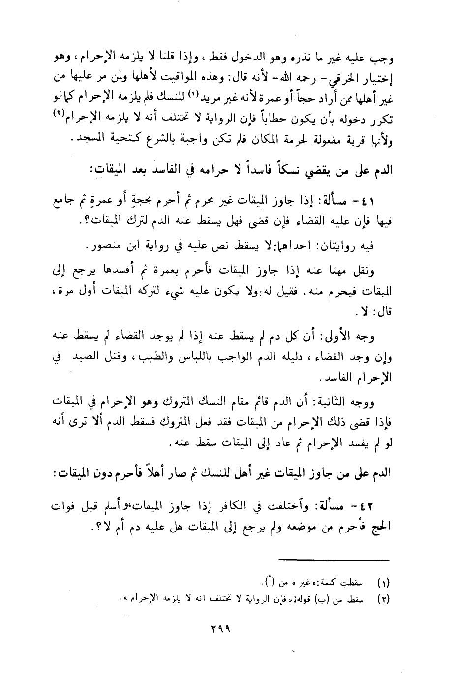 42 - مسألة: واختلفت في الكافر إذا جاوز الميقات، وأسلم قبل فوات الحج فأحرم من موضعه ولم يرجع إلى الميقات هل عليه دم أم لا؟.