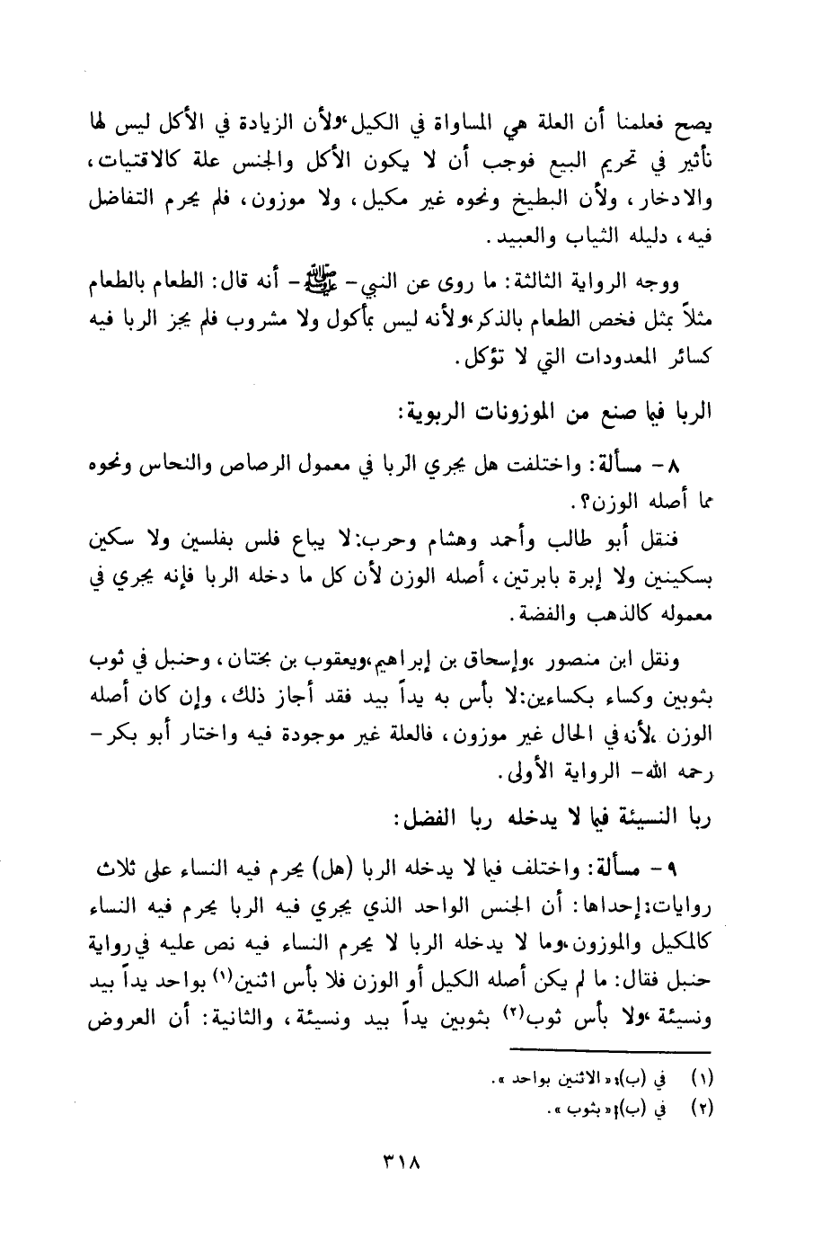 ونقل ابن منصور، وإسحاق بن إبراهيم، ويعقوب بن بختان، وحنبل في ثوب بثوبين وكساء بكساءين: لا بأس به يداً بيد فقد أجاز ذلك، وإن كان أصله الوزن، لأنه في الحال غير موزون، فالعلة غير موجودة فيه واختار أبو بكر ـ رحمه الله ـ الرواية الأولى.