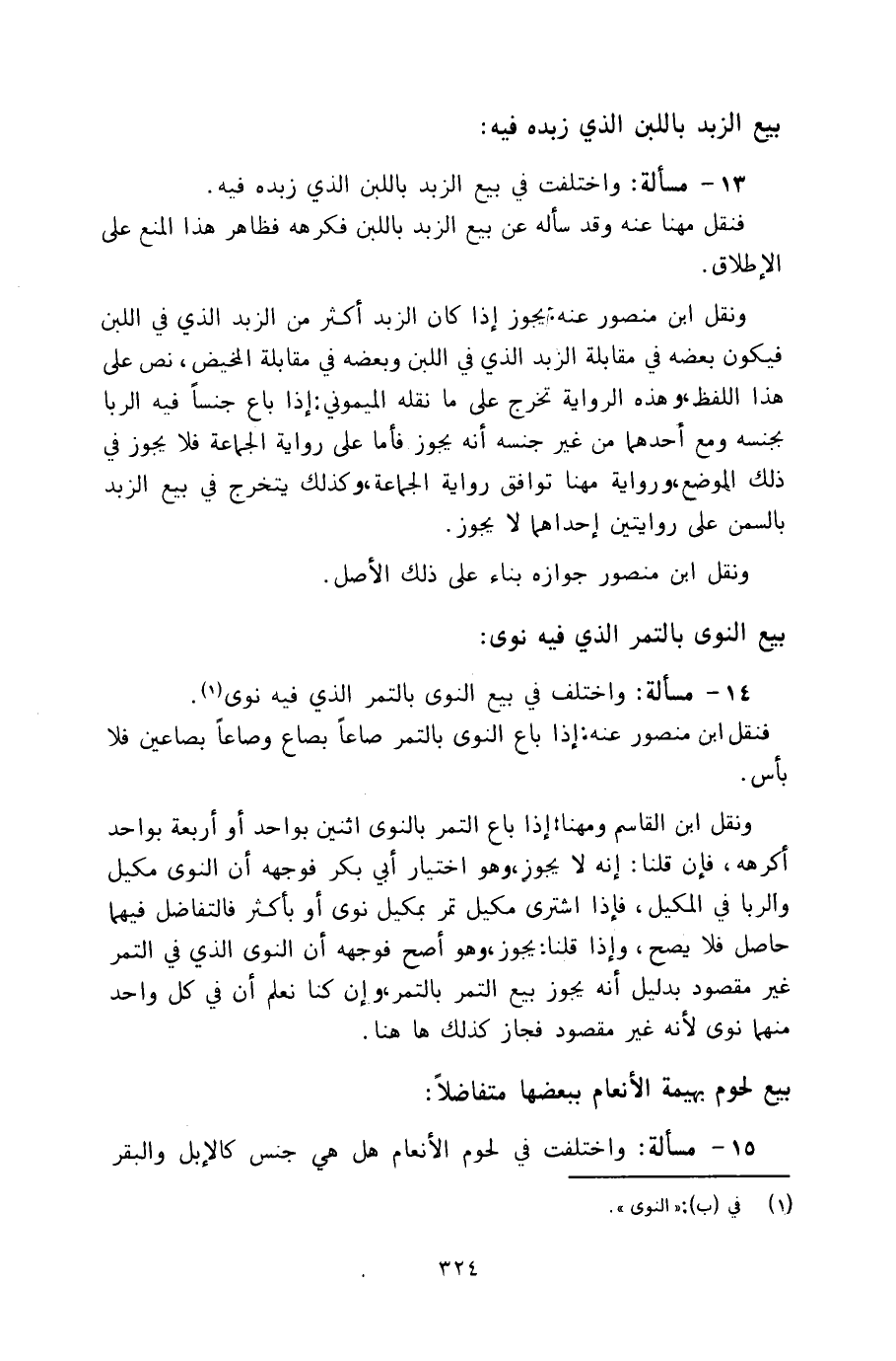 14 - مسألة: واختلف في بيع النوى بالتمر الذي فيه نوى.