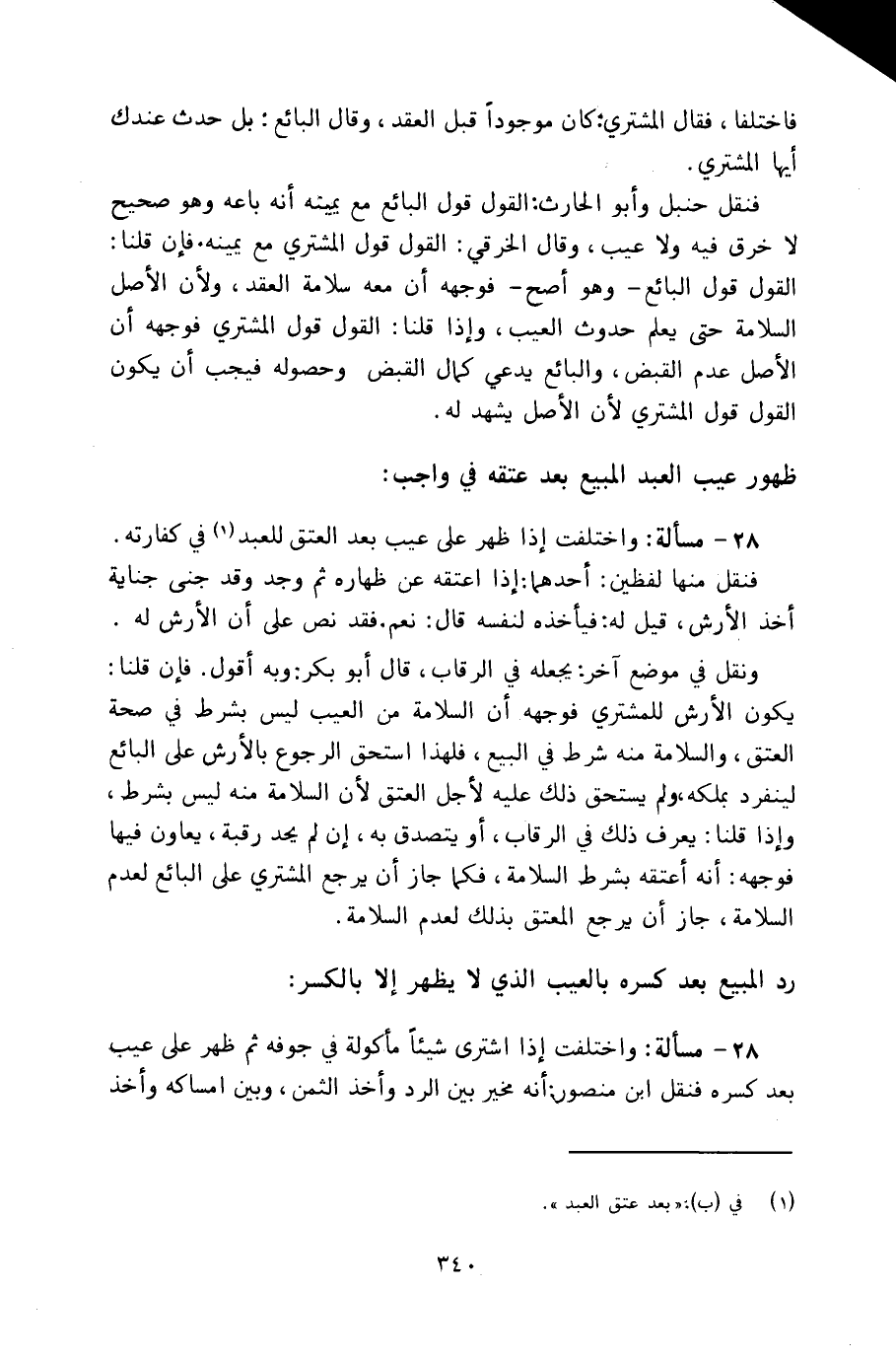 28 - مسألة: واختلفت إذا ظهر على عيب بعد العتق للعبد في كفارته.