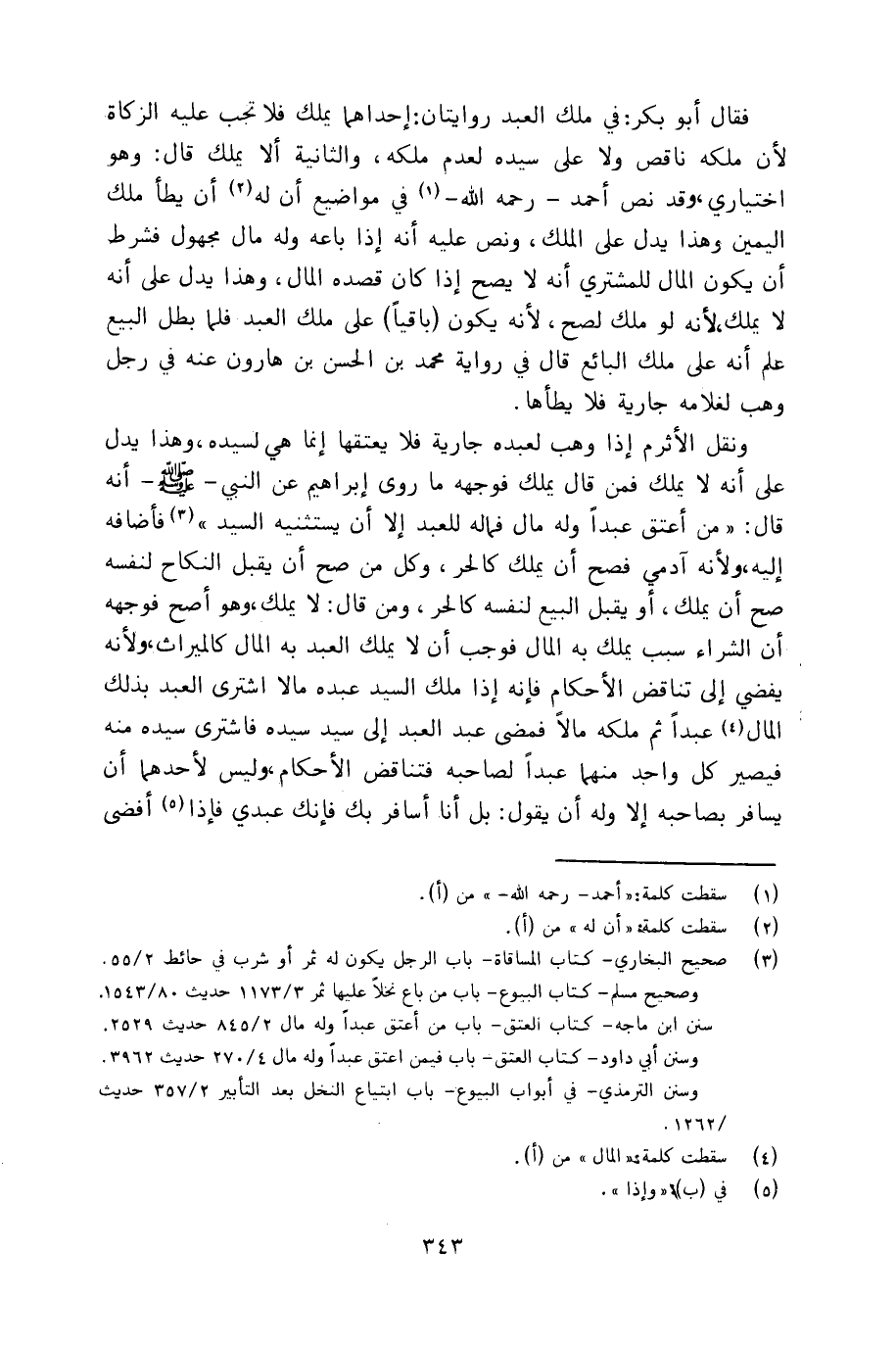 فقال أبو بكر: في ملك العبد روايتان: إحداهما يملك فلا تجب عليه الزكاة لأن ملكه ناقص ولا على سيده لعدم ملكه، والثانية ألا يملك قال: وهو اختياري، وقد نص أحمد ـ رحمه الله ـ في مواضيع أن له أن يطأ ملك اليمين وهذا يدل على الملك، ونص عليه أنه إذا باعه وله مال مجهول فشرط أن يكون للمشتري أنه لا يصح إذا كان قصده المال، وهذا يدل على أنه لا يملك، لأنه لو ملك لصح، لأنه يكون (باقياً) على ملك العبد فلما بطل البيع علم أنه على ملك البائع قال في رواية محمد بن الحسن بن هارون عنه في رجل وهب لغلامه جارية فلا يطأها.
