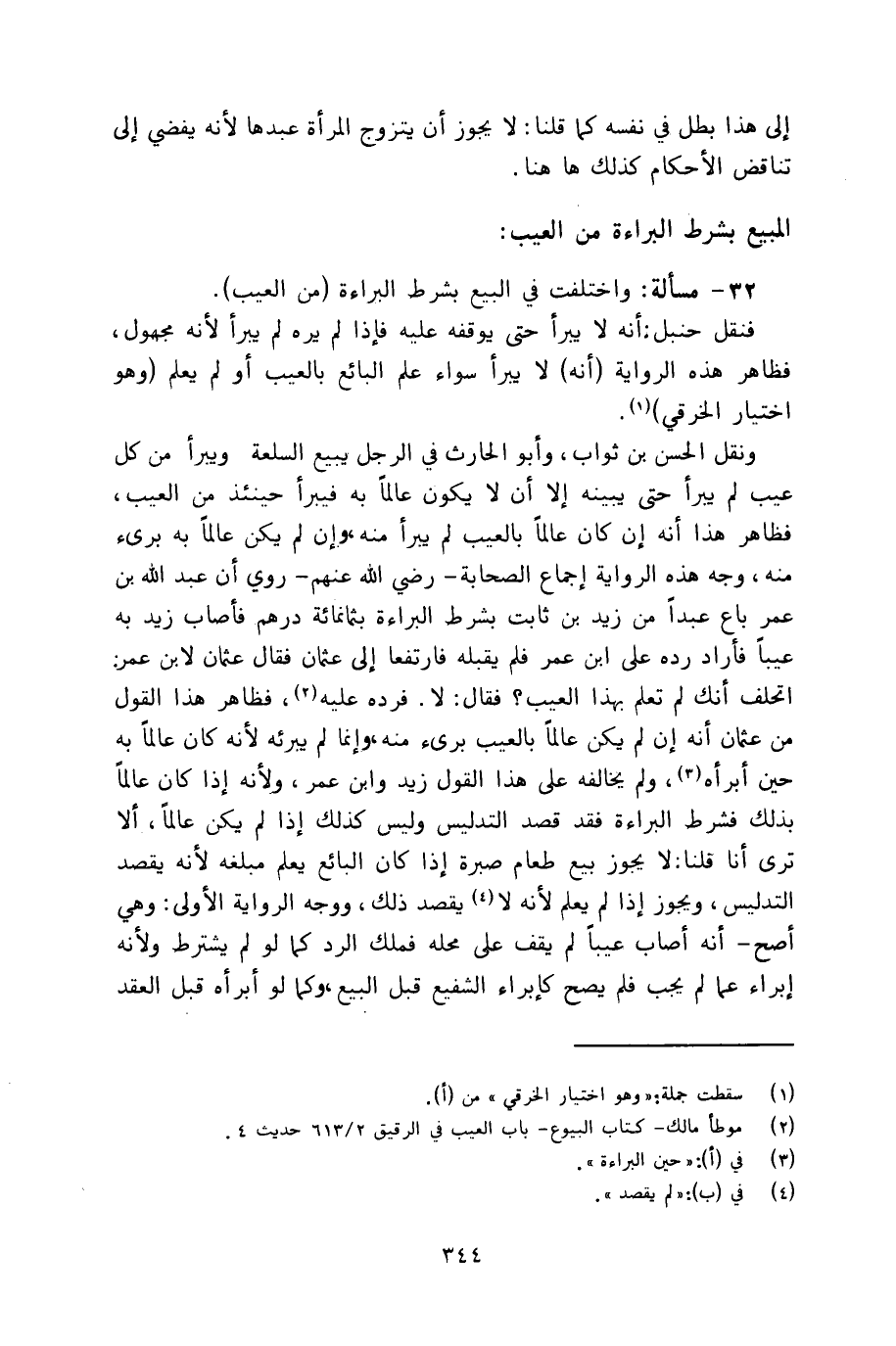 32 - مسألة: واختلفت في البيع بشرط البراءة (من العيب).