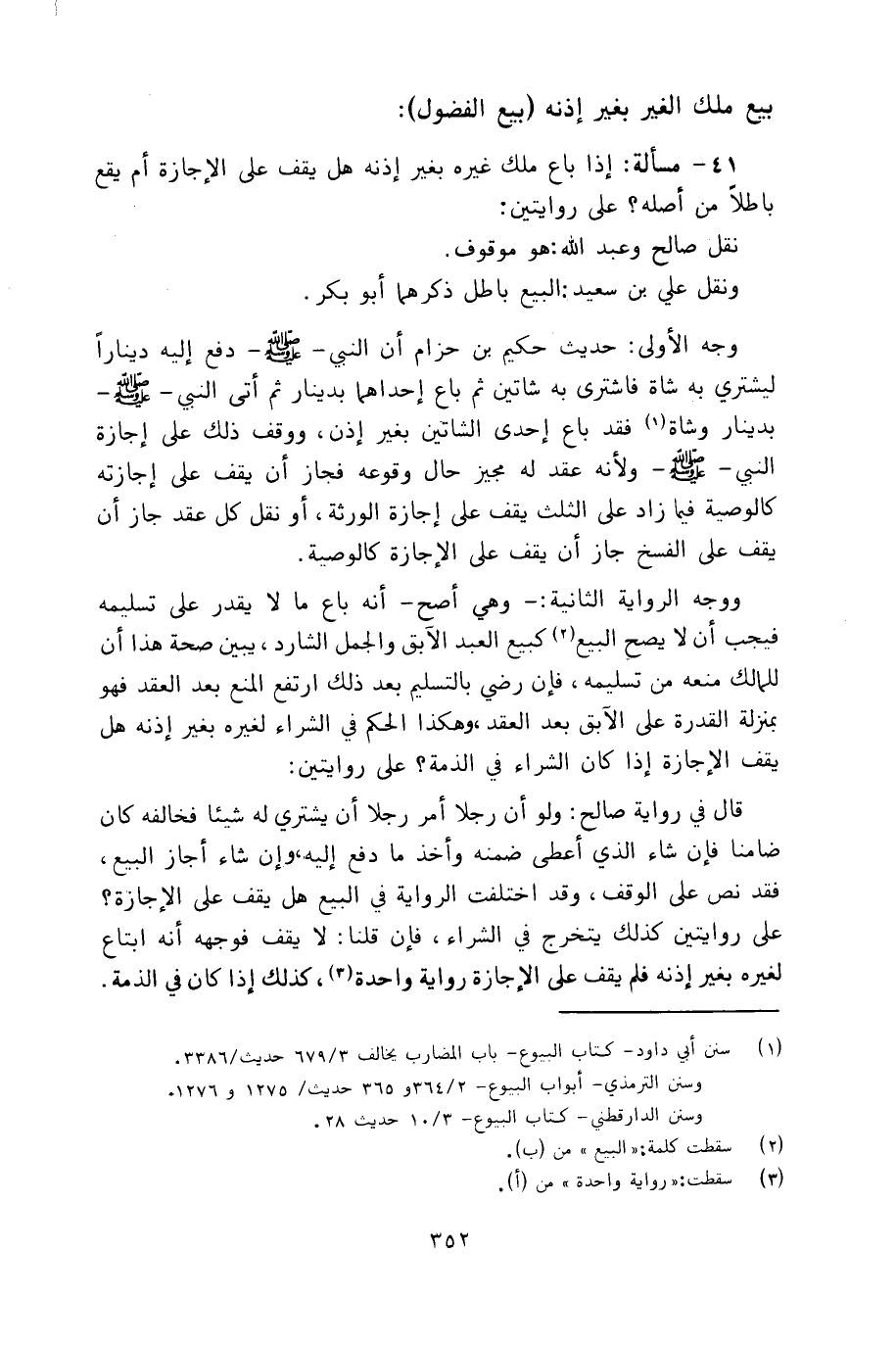 41 - مسألة: إذا باع ملك غيره بغير إذنه هل يقف على الإجازة أم يقع باطلاً من أصله؟ على روايتين: