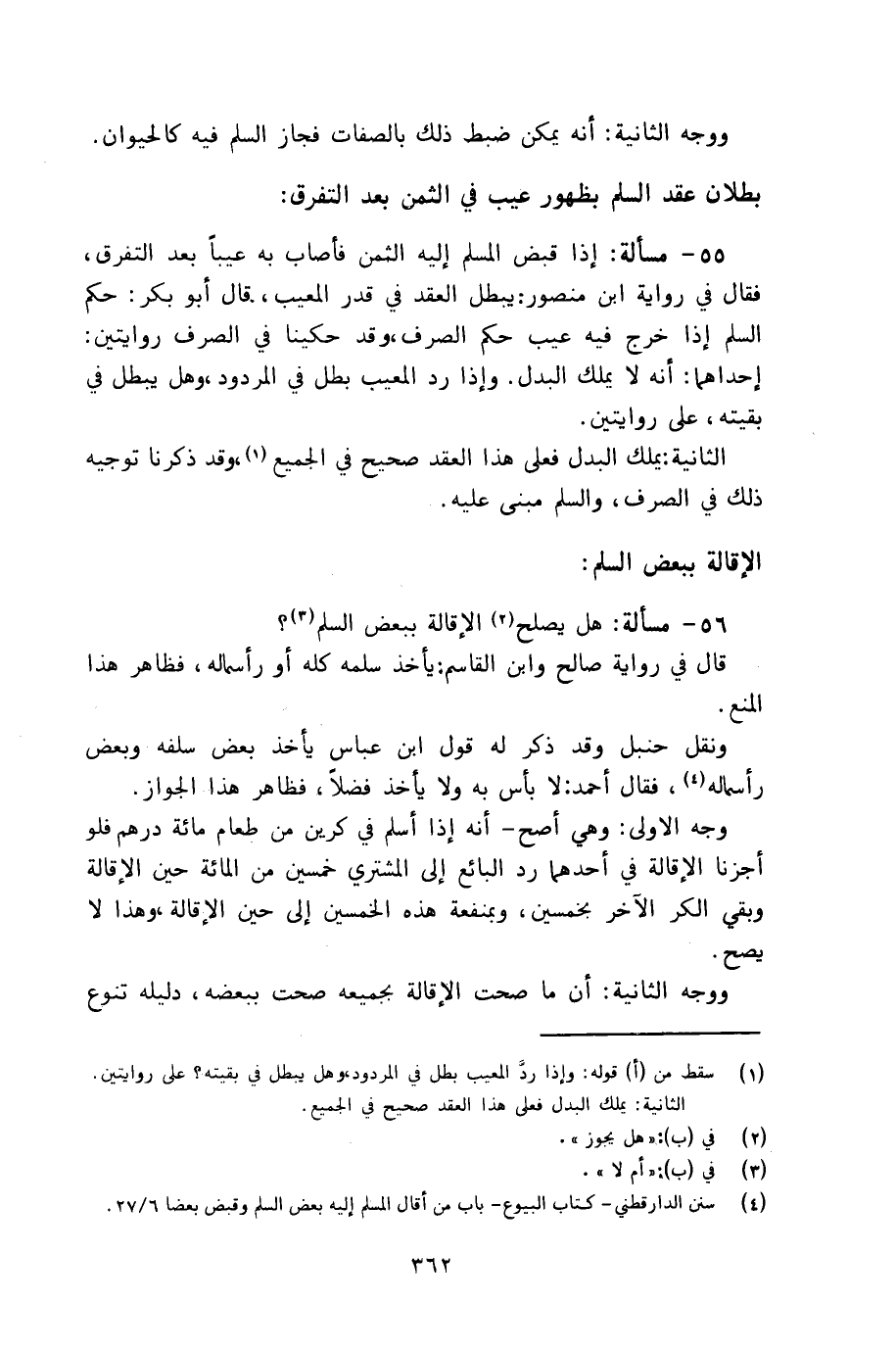 55 - مسألة: إذا قبض المسلم إليه الثمن فأصاب به عيباً بعد التفرق، فقال في رواية ابن منصور: يبطل العقد في قدر المعيب، قال أبو بكر: حكم السلم إذا خرج فيه عيب حكم الصرف، وقد حكينا في الصرف روايتين: إحداهما: أنه لا يملك البدل. وإذا رد المعيب بطل في المردود، وهل يبطل في بقيته، على روايتين.