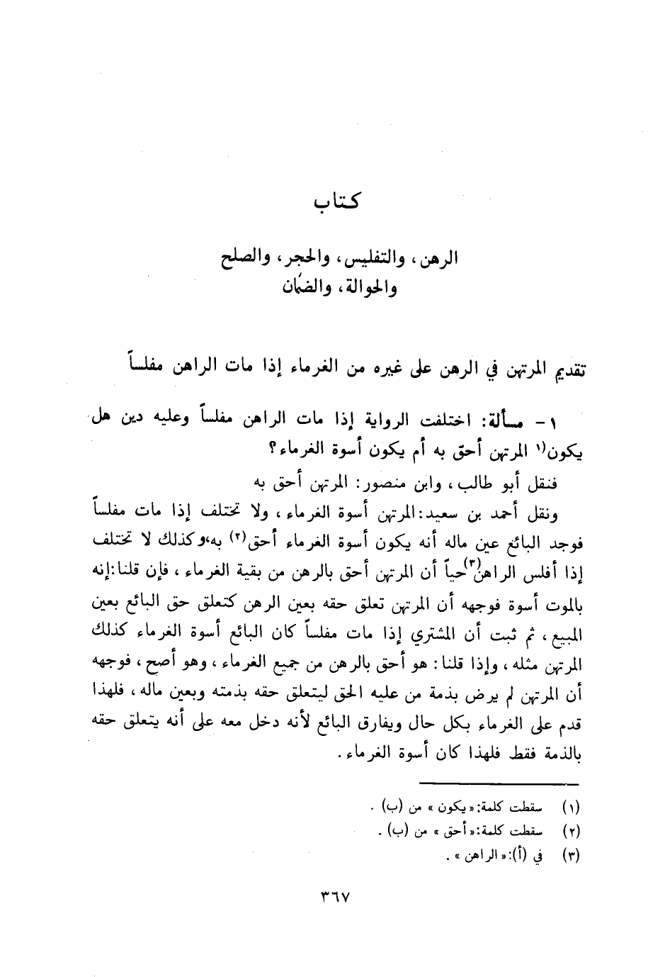 1 - مسألة اختلفت الرواية إذا مات الراهن مفلساً وعليه دين هل يكون المرتهن أحق به أم يكون أسوة الغرماء؟