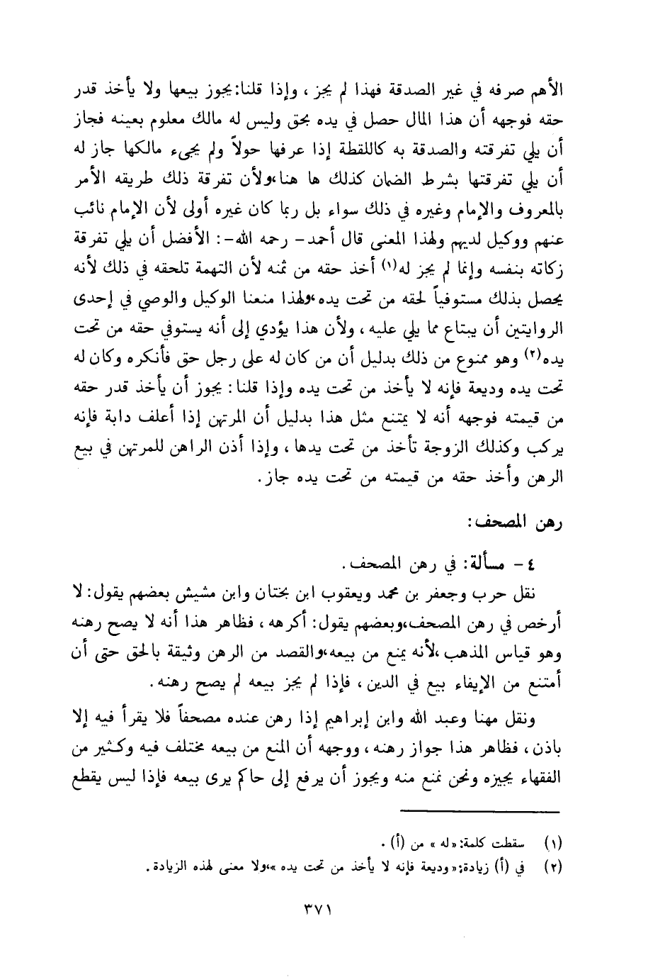 الأهم صرفه في غير الصدقة فهذا لم يجز، وإذا قلنا: يجوز بيعها ولا يأخذ قدر حقه فوجهه أن هذا المال حصل في يده بحق وليس له مالك معلوم بعينه فجاز أن يلي تفرقته والصدقة به كاللقطة إذا عرفها حولاً ولم يجىء مالكها جاز له أن يلي تفرقتها بشرط الضمان كذلك ها هنا، ولأن تفرقة ذلك طريقة الأمر بالمعروف والإمام وغيره في ذلك سواء بل ربما كان غيره أولى لأن الإمام نائب عنهم ووكيل لديهم ولهذا المعنى قال أحمد ـ رحمه الله ـ: الأفضل أن يلي تفرقة زكاته بنفسه وإنما لم يجز له أخذ حقه من ثمنه لأن التهمة تلحقه في ذلك لأنه يحصل بذلك مستوفياً لحقه من تحت يده، ولهذا منعنا الوكيل والوصي في إحدى الروايتين أن يبتاع مما يلي عليه، ولأن هذا يؤدي إلى أنه يستوفي حقه من تحت يده وهو ممنوع من ذلك بدليل أن من كان له على رجل حق فأنكره وكان له تحت يده وديعة فإنه لا يأخذ من تحت يده وإذا قلنا: يجوز أن يأخذ قدر حقه من قيمته فوجهه أنه لا يمتنع مثل هذا بدليل أن المرتهن إذا أعلف دابة فإنه يركب وكذلك يركب وكذلك الزوجة تأخذ من تحت يدها، وإذا أذن الراهن للمرتهن في بيع الرهن وأخذ حقه من قيمته من تحت يده جاز.