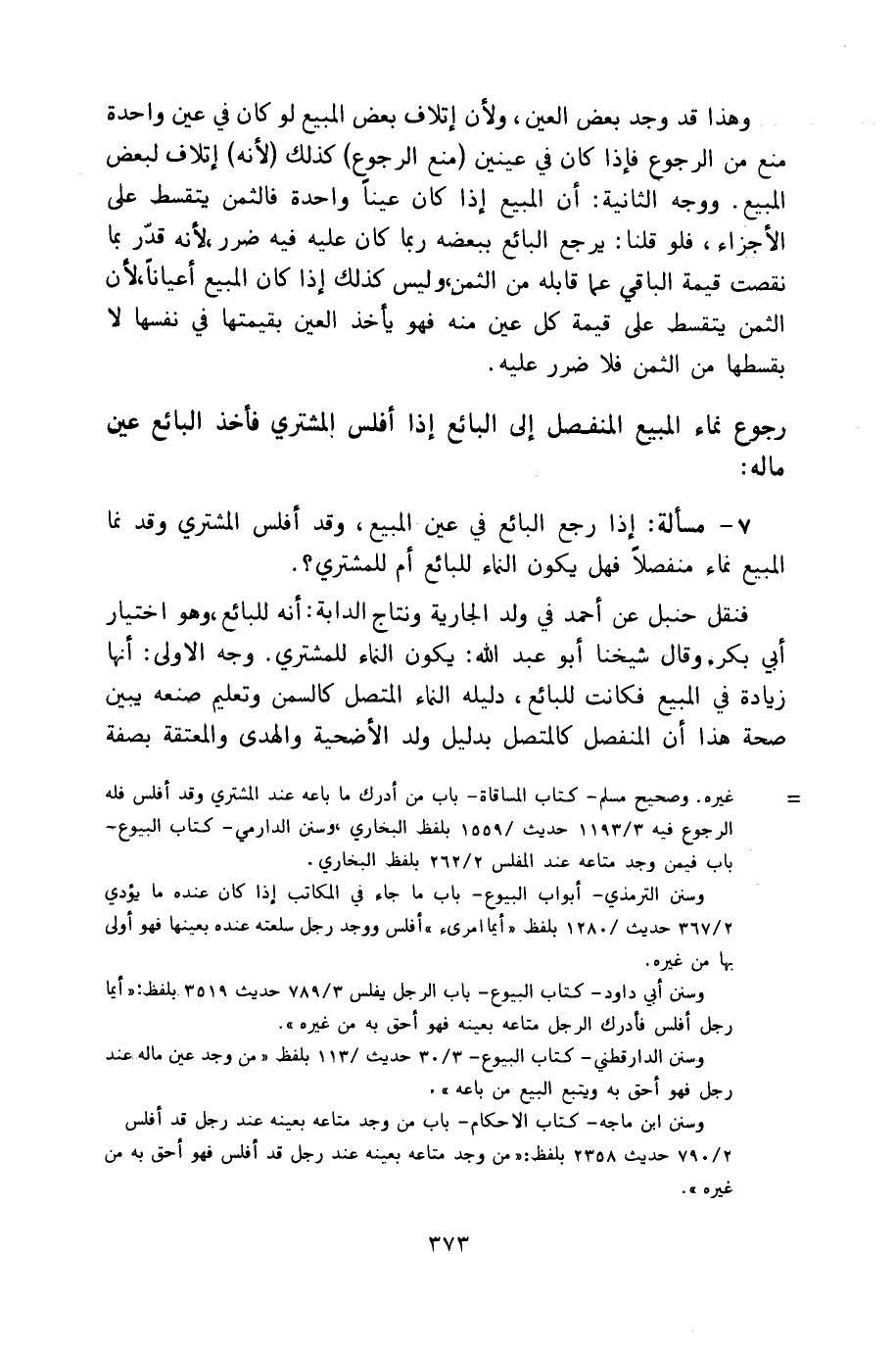 7 - مسألة: إذا رجع البائع في عين المبيع، وقد أفلس المشتري وقد نما المبيع نماء منفصلاً فهل يكون النماء للبائع أم للمشتري؟