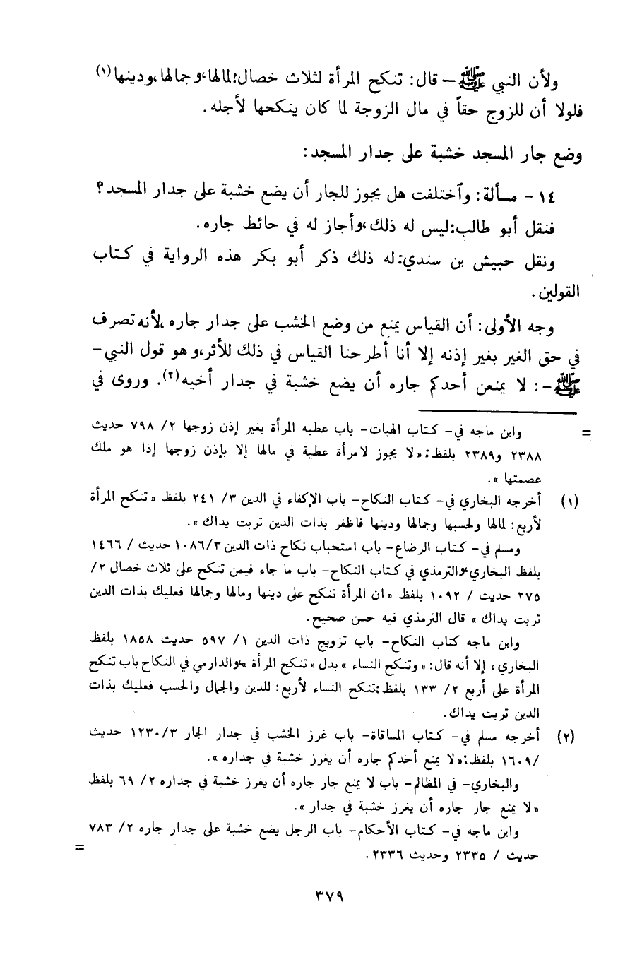 14 - مسألة: واختلفت هل يجوز للجار أن يضع خشبة على جدار المسجد؟