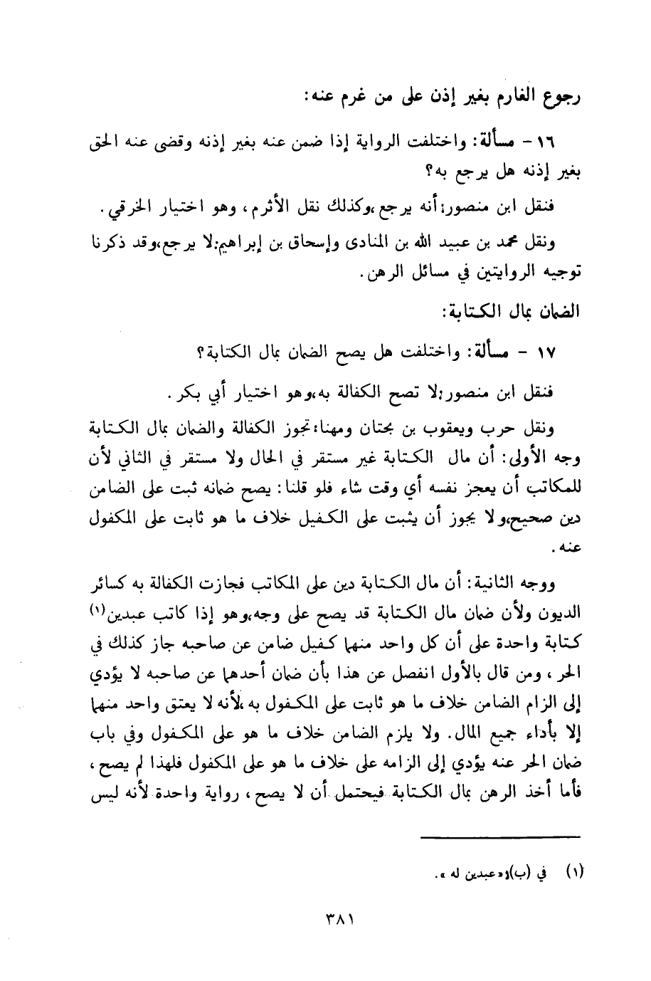 ،17 ـ مسألة: واختلفت هل يصح الضمان بمال الكتابة؟