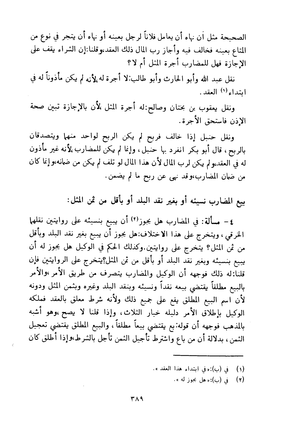 4 - مسألة: في المضارب هل يجوز أن يبيع بنسيئه على روايتين نقلهما الخرقي، ويتخرج على هذا الاختلاف: هل يجوز أن يبيع بغير نقد البلد وبأقل من ثمن المثل؟ يتخرج على روايتين. وكذلك الحكم في الوكيل هل يجوز له أن يبيع بنسيئه وبغير نقد البلد أو بأقل من ثمن المثل؟ يتخرج على الروايتين فإن قلنا: له ذلك فوجهه أن الوكيل والمضارب يتصرف من طريق الأمر، والأمر بالبيع مطلقاً يقتضي بيعه نقداً ونسيئه وبنقد البلد وغيره وبثمن المثل ودونه لأن اسم البيع المطلق يقع على جميع ذلك ولأنه شرط معلق بالعقد فملكه الوكيل بإطلاق الأمر دليله خيار الثلاث، وإذا قلنا لا يصح، وهو أشبه بالمذهب فوجهه أن قوله: بع يقتضي بيعاً مطلقاً، والبيع المطلق يقتضي تعجيل الثمن، بدلالة أن من باع واشترط تأجيل الثمن تأجل بالشرط، وإذا أطلق كان