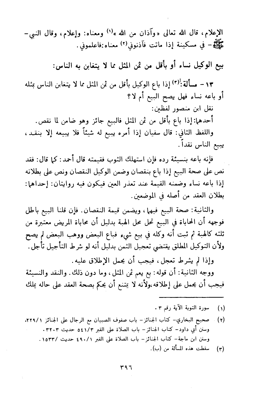 13 - مسألة: إذا باع الوكيل بأقل من ثمن المثل مما لا يتغابن الناس بمثله أو باعه نساء فهل يصح البيع أم لا؟