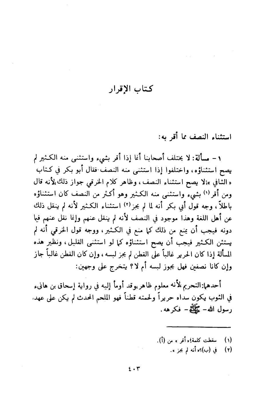 1 - مسألة: لا يختلف أصحابنا إنما إذا أقر بشيء واستثنى منه الكثير لم يصح استثناؤه، واختلفوا إذا استثنى منه النصف فقال أبو بكر في كتاب الشافي لا يصح استثناء النصف، وظاهر كلام الخرقي جواز ذلك، لأنه قال ومن أقر بشيء واستثنى منه الكثير وهو أكثر من النصف كان استثناؤه باطلاً، وجه قول أبي بكر أنه لما لم يجز استثناء الكثير لأنه لم ينقل ذلك عن أهل اللغة وهذا موجود في النصف لأنه لم ينقل عنهم وإنما نقل عنهم فيما دونه فيجب أن يمنع من ذلك كما منع في الكثير، ووجه قول الخرقي أنه لم يستثنِ الكثير فيجب أن يصح استثناؤه كما لو استثنى القليل، ونظير هذه المسألة إذا كان الحرير غالباً على القطن لم يجز لبسه، وإن كان القطن غالباً جاز وإن كانا نصفين فهل يجوز لبسه أم لا؟ يتخرج على وجهين: