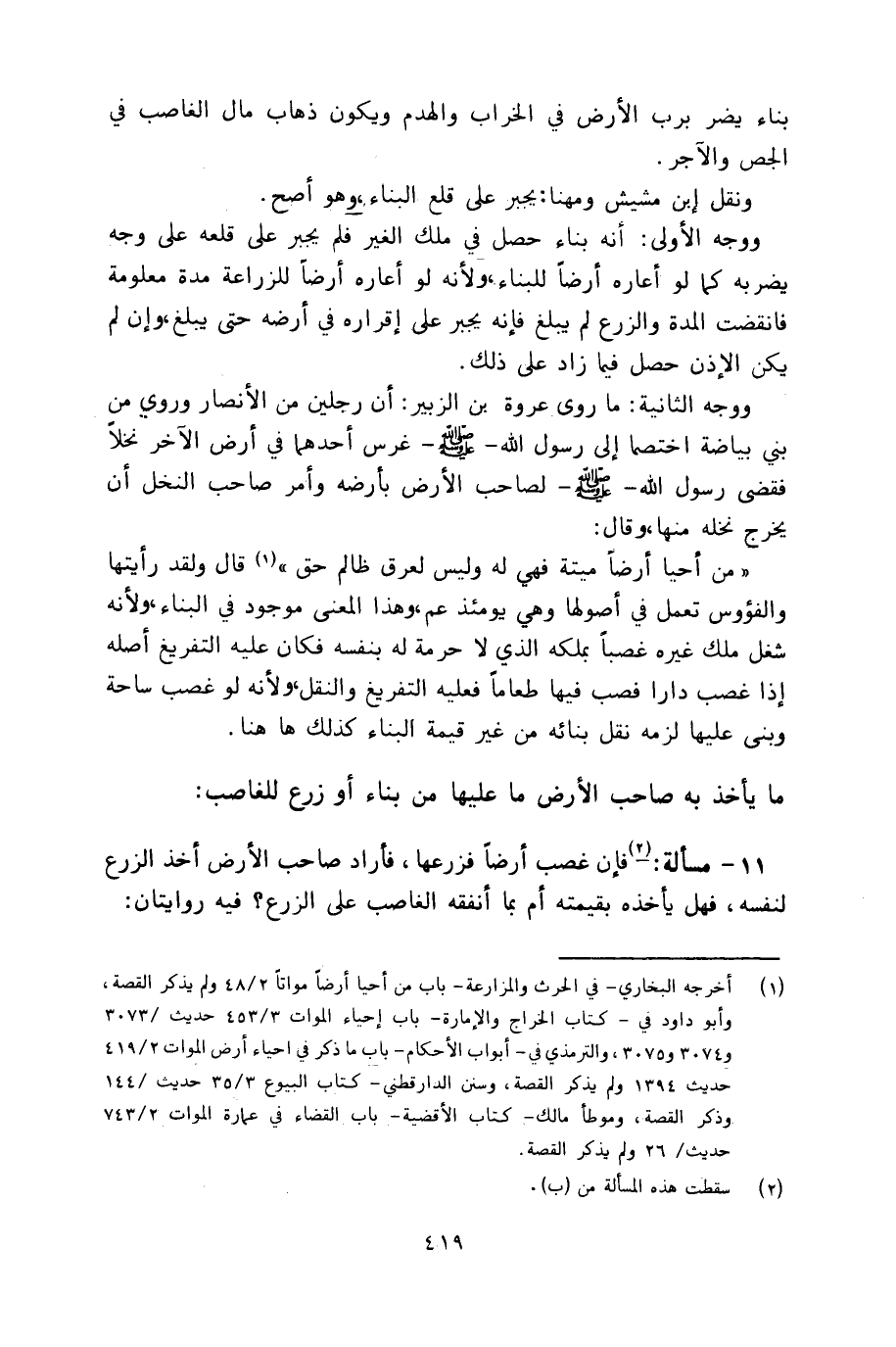 ووجه الثانية: ما روى عروة بن الزبير: أن رجلين من الأنصار وروي من بني بياضة اختصما إلى رسول الله ـ صلى الله عليه وسلم غرس أحدهما في أرض الآخر نخلاً فقضى رسول الله ـ صلى الله عليه وسلم لصاحب الأرض بأرضه وأمر صاحب النخل أن يخرج نخله منها، وقال: