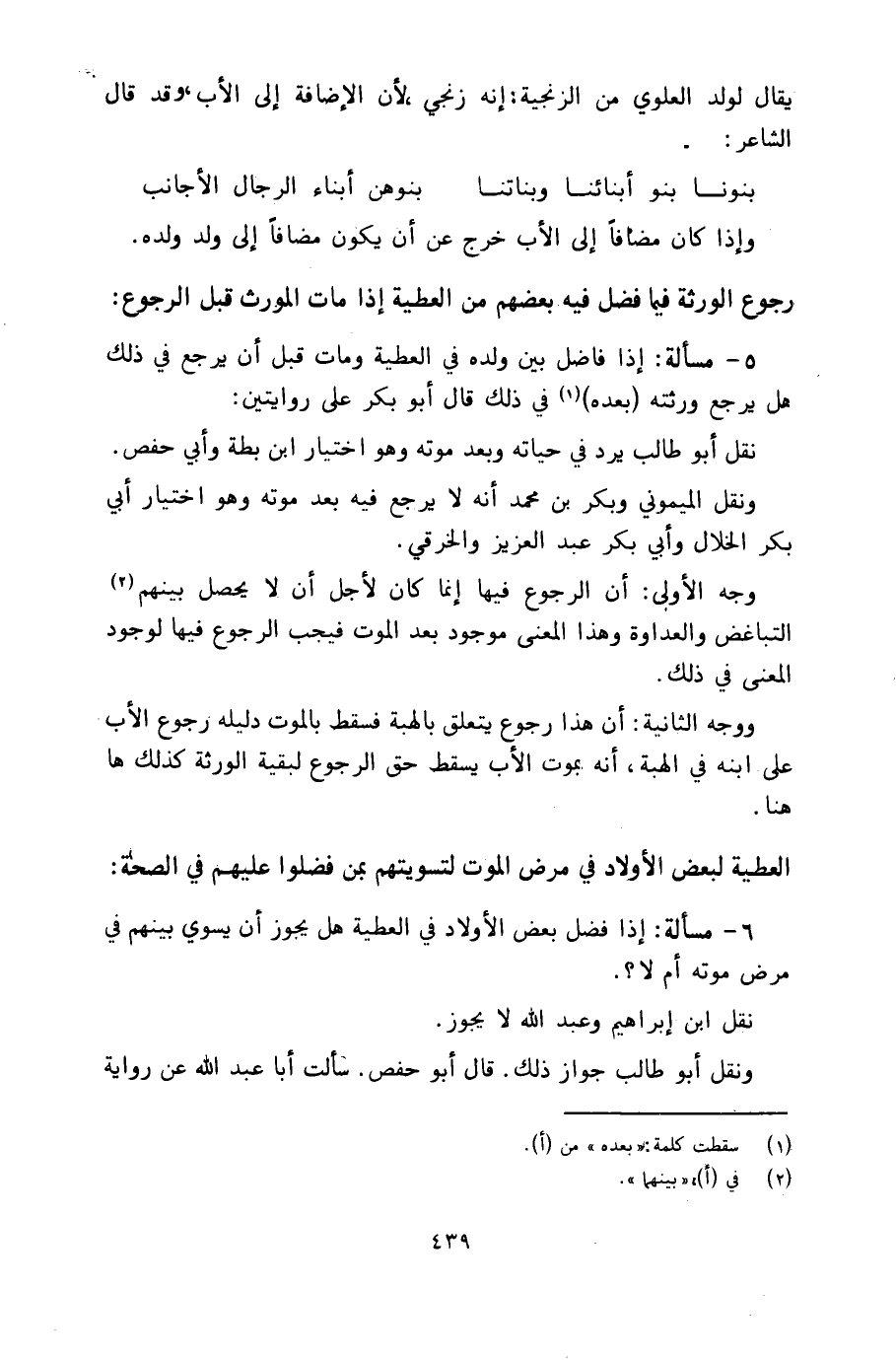 5 - مسألة: إذا فاضل بين ولده في العطية ومات قبل أن يرجع في ذلك هل يرجع ورثته (بعده) في ذلك قال أبو بكر روايتين:
