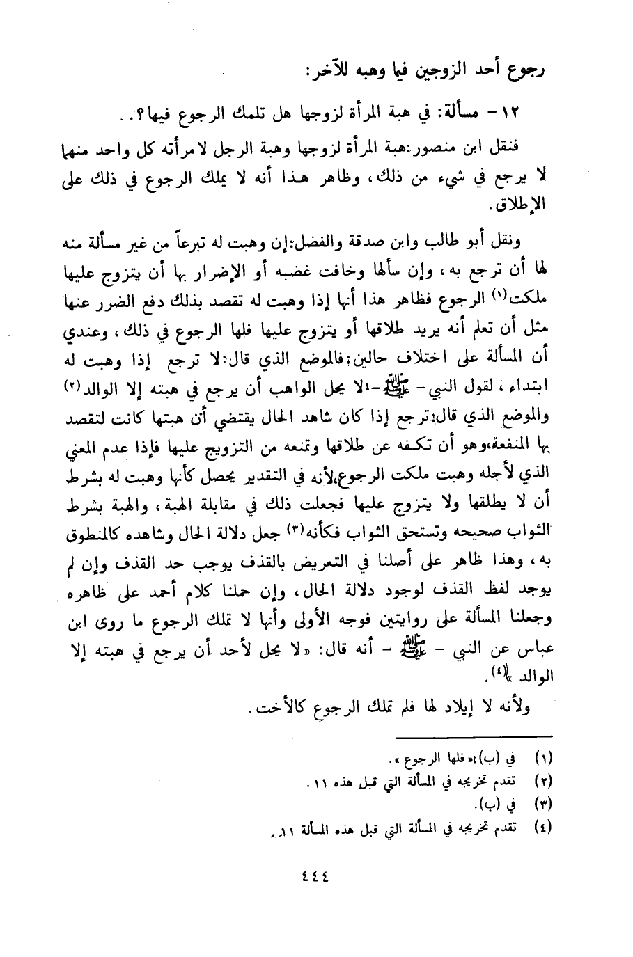 12 - مسألة: في هبة المرأة لزوجها هل تملك الرجوع فيها؟.