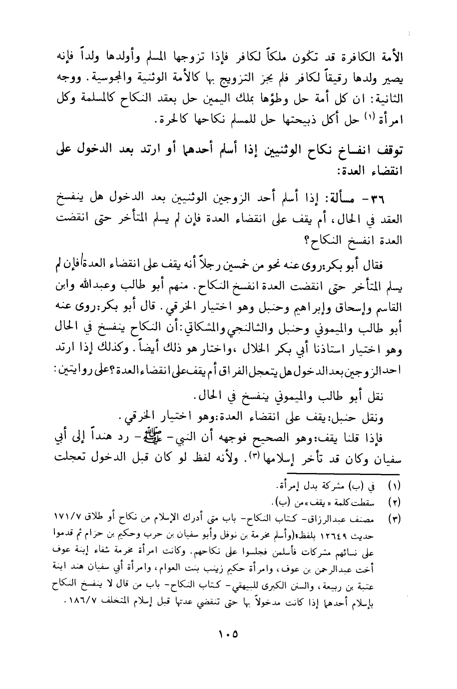 36 - مسألة: إذا أسلم أحد الزوجين الوثنيين بعد الدخول هل ينفسخ العقد في الحال، أم يقف على انقضاء العدة فإن لم يسلم المتأخر حتى انقضت العدة انفسخ النكاح؟