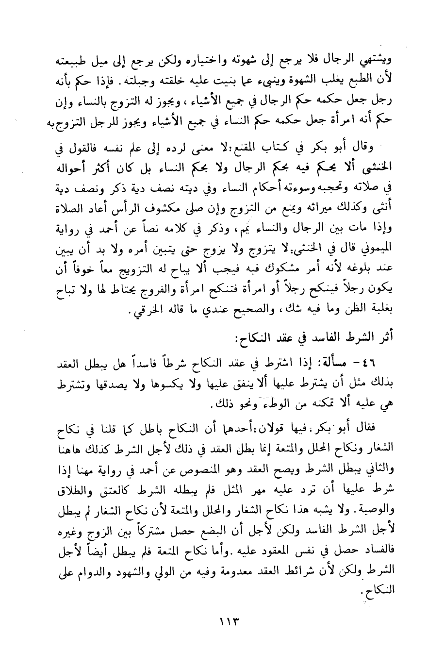 46 - مسألة: إذا اشترط في عقد النكاح شرطاً فاسداً هل يبطل العقد بذلك مثل أن يشترط عليها ألا ينفق عليها ولا يكسوها ولا يصدقها وتشترط هي عليه ألا تمكنه من الوطء ونحو ذلك.