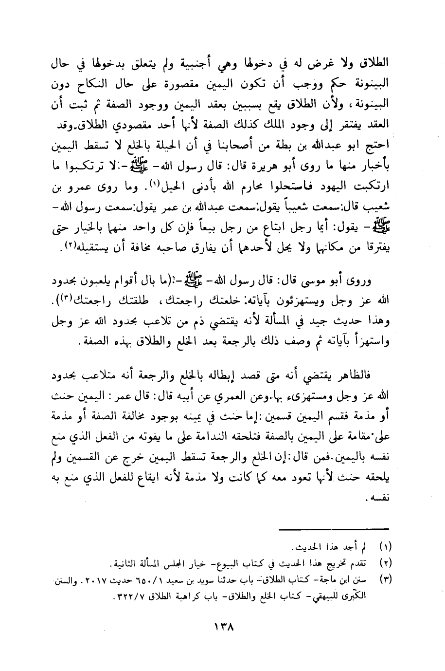 فالظاهر يقتضي أنه متى قصد إبطاله بالخلع والرجعة أنه متلاعب بحدود الله عزّ وجلّ ومستهزىء بها. وعن العمري عن أبيه قال: قال عمر: اليمين حنث أو مذمة فقسم اليمين قسمين: إما حنث في يمينه بوجود مخالفة الصفة أو مذمة على مقامة على اليمين بالصفة فتلحقه الندامة على ما يفوته من الفعل الذي منع نفسه باليمين. فمن قال: إن الخلع والرجعة تسقط اليمين خرج عن القسمين ولم يلحقه حنث لأنها تعود معه كما كانت ولا مذمة لأنه إيقاع للفعل الذي منع به نفسه.