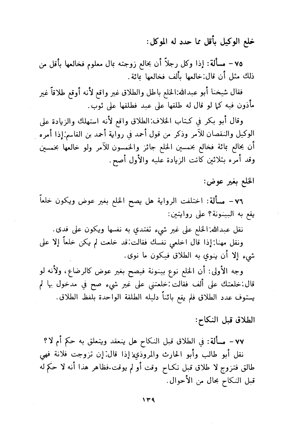 76 - مسألة: اختلفت الرواية هل يصح الخلع بغير عوض ويكون خلعاً يقع به البينونة؟ على روايتين: