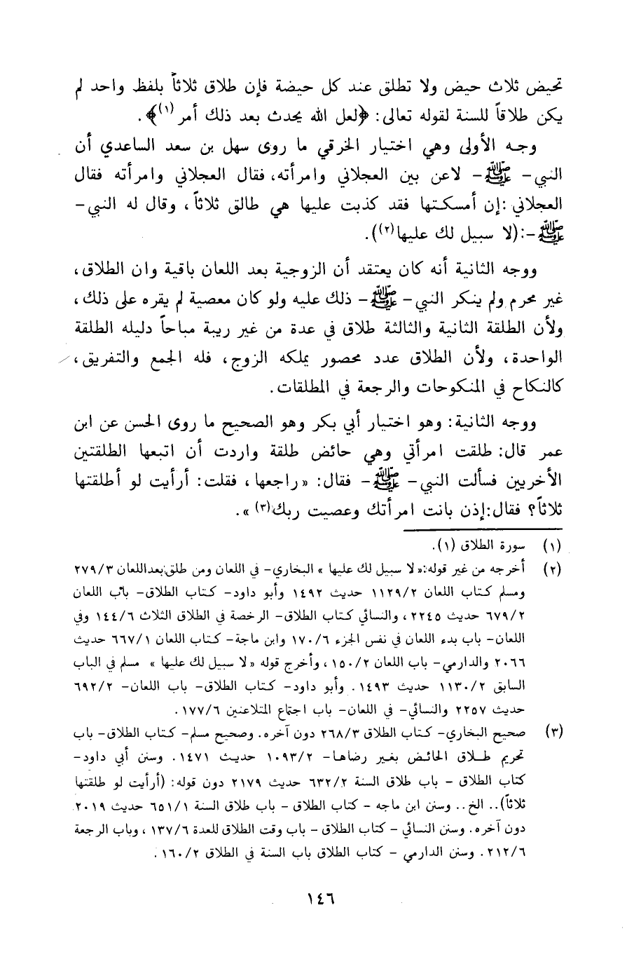 ووجه الثانية: أنه كان يعتقد أن الزوجية بعد اللعان باقية وأن الطلاق، غير محرم ولم ينكر ـ النبي صلى الله عليه وسلم ـ ذلك عليه ولو كان معصية لم يقره على ذلك، ولأن الطلقة الثانية والثالثة طلاق في عدة من غير ريبة مباحاً دليله الطلقة الواحدة، ولأن الطلاق عدد محصور يملكه الزوج، فله الجمع والتفريق، كالنكاح في المنكوحات والرجعة في المطلقات.