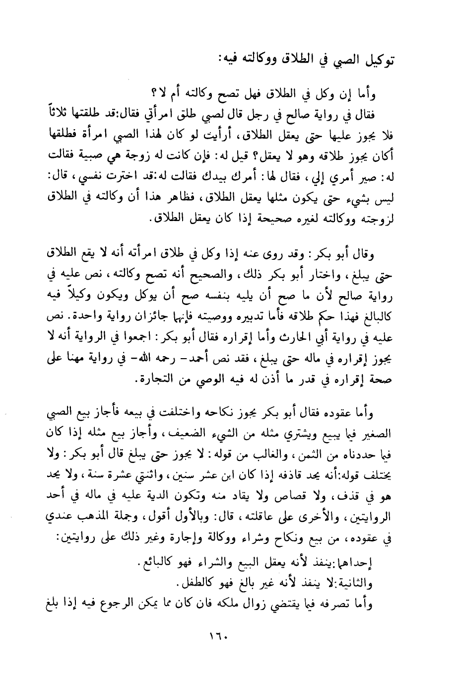وقال أبو بكر: وقد روي عنه إذا وكل في طلاق امرأته أنه لا يقع الطلاق حتى يبلغ، واختار أبو بكر ذلك، والصحيح أنه تصح وكالته، نص عليه في رواية صالح لأن ما صح أن يليه بنفسه صح أن يوكل ويكون وكيلاً فيه كالبالغ فهذا حكم طلاقه فأما تدبيره ووصيته فإنهما جائزان رواية واحدة. نص عليه في رواية أبي الحارث وأما إقراره فقال أبو بكر: اجمعوا في الرواية أنه لا يجوز إقراره في ماله حتى يبلغ، فقد نص أحمد ـ رحمه الله ـ في رواية مهنا على صحة إقراره في قدر ما أذن له فيه الوصي من التجارة.
