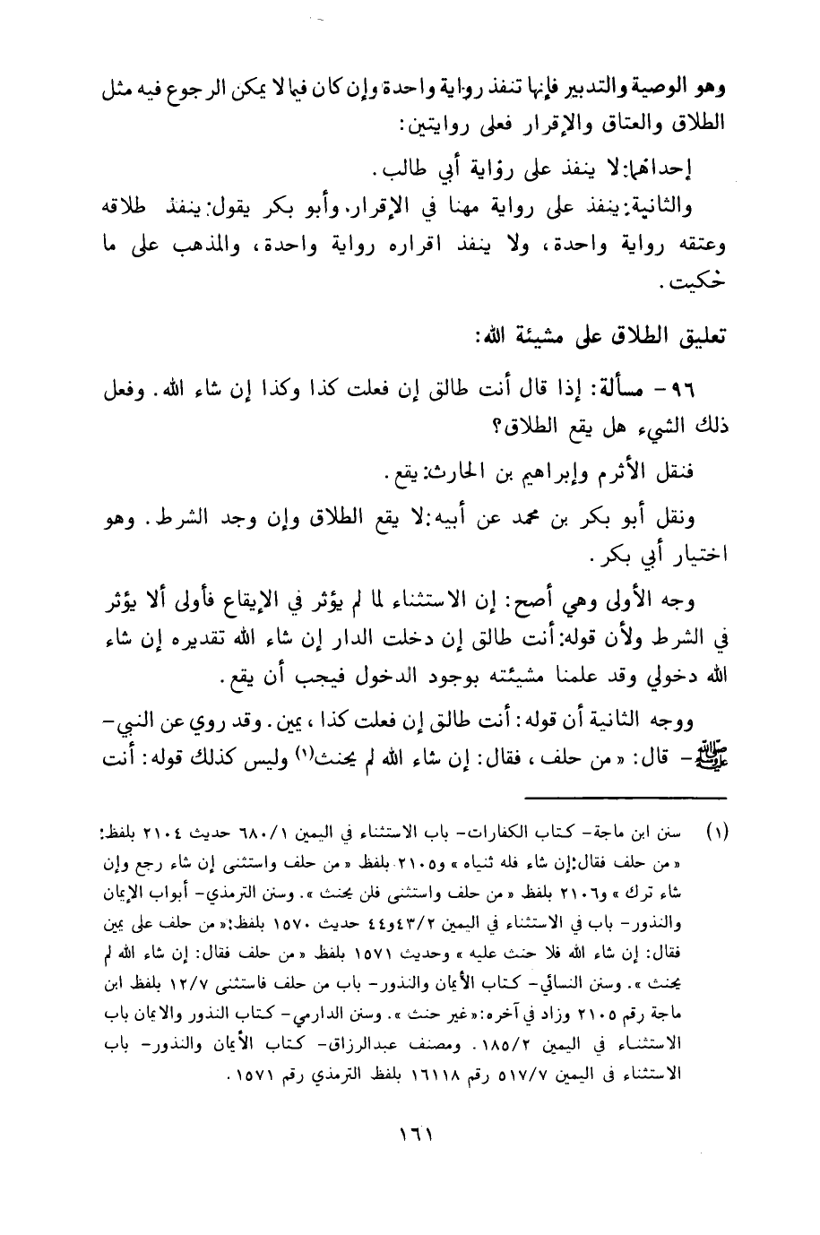 96 - مسألة: إذا قال أنت طالق إن فعلت كذا وكذا إن شاء الله. وفعل ذلك لشيء هل يقع الطلاق؟
