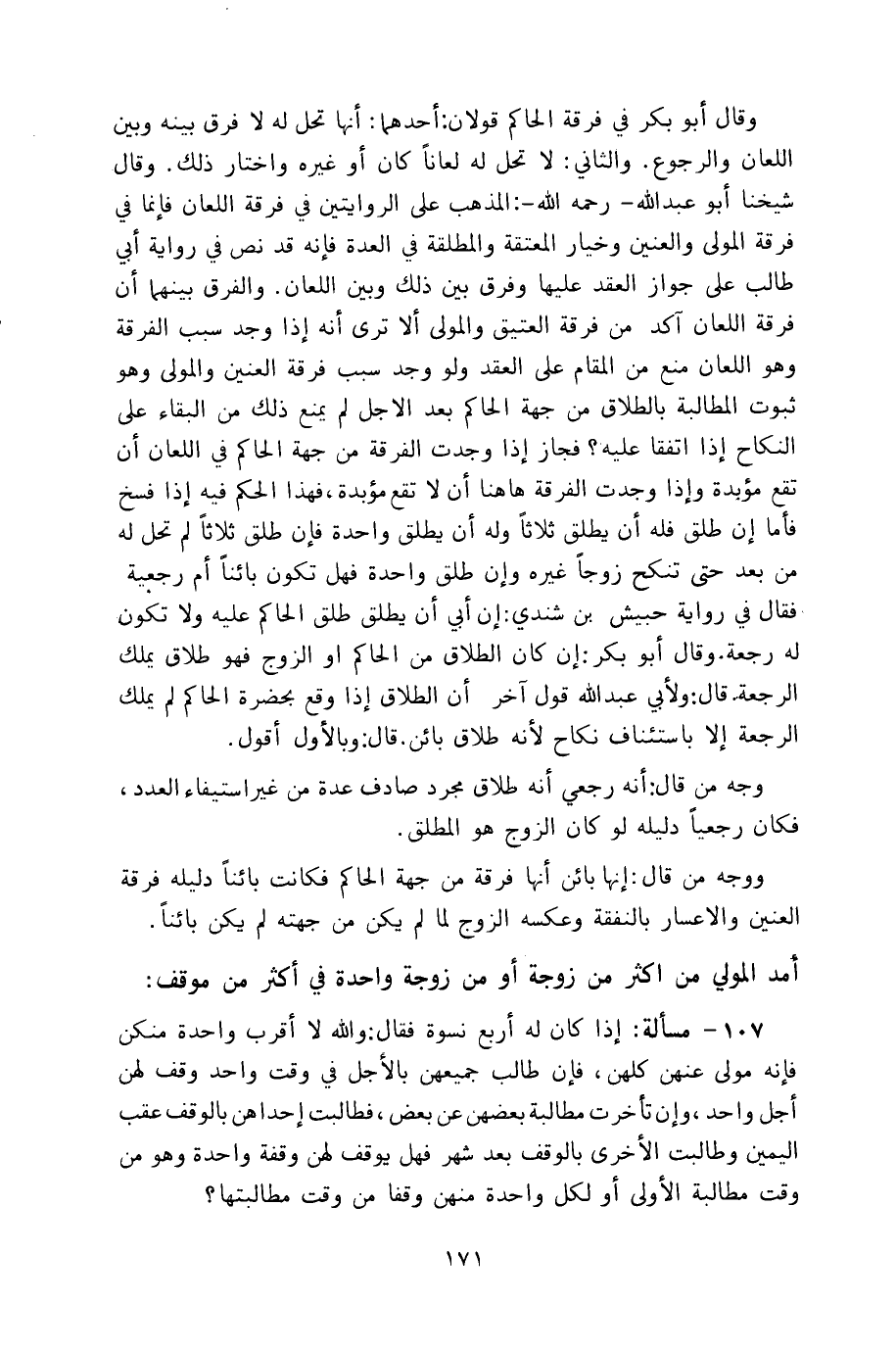 وقال أبو بكر في فرقة الحاكم قولان: أحدهما: أنها تحل له لا فرق بينه وبين اللعان والرجوع. والثاني: لا تحل له لعاناً كان أو غيره واختار ذلك. وقال شيخنا أبو عبد الله ـ رحمه الله ـ: المذهب على الروايتين في فرقة اللعان فإنما في فرقة المولى والعنين وخيار المعتقة والمطلقة في العدة فإنه قد نص في رواية أبي طالب على جواز العقد عليها وفرق بين ذلك وبين اللعان. والفرق بينهما أن فرقة اللعان آكد من فرقة العتيق والمولى ألا ترى أنه وجد سبب الفرقة وهو اللعان منع من المقام على العقد ولو وجد سبب فرقة العنين والمولى وهو ثبوت المطالبة بالطلاق من جهة الحاكم بعد الأجل لم يمتنع ذلك من البقاء على النكاح إذا اتفقا عليه؟ فجاز إذا وجدت الفرقة من جهة الحاكم في اللعان أن تقع مؤبدة وإذا وجدت الفرقة هاهنا أن لا تقع مؤبدة، فهذا الحكم فيه إذا فسخ فأما إن طلق فله أن يطلق ثلاثاً وله أن يطلق واحدة فإن طلق ثلاثاً لم تحل له من بعد حتى تنكح زوجاً غيره وإن طلق واحدة فهل تكون بائناً أم رجعية فقال في رواية حبيش بن شندي: إن أبي أن يطلق طلق الحاكم عليه ولا تكون له رجعة. وقال أبو بكر: إن كان الطلاق من الحاكم أو الزوج فهو طلاق يملك الرجعة. قال: ولأبي عبد الله قول آخر أن الطلاق إذا وقع بحضرة الحاكم لم يملك الرجعة إلا باستئناف نكاح لأنه طلاق بائن. قال: وبالأول أقول.