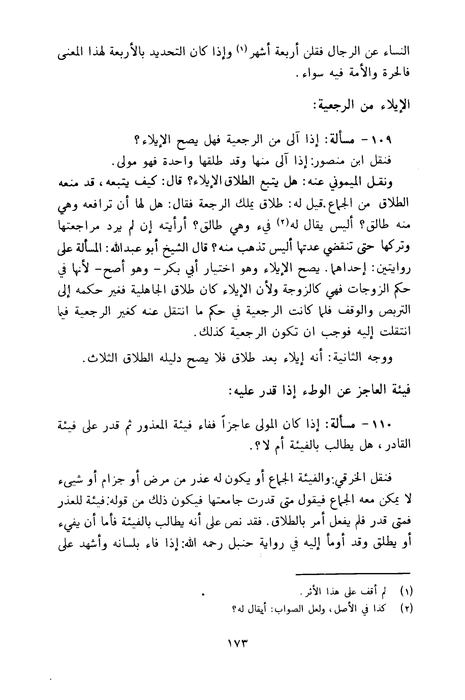 ونقل الميموني عنه: هل يتبع الطلاق الإيلاء؟ قال: كيف يتبعه، قد منعه الطلاق من الجماع، قيل له: طلاق يملك الرجعة، فقال: هل لها أن ترافعه وهي منه طالق؟ أليس يقال له فيء وهي طالق؟ أرأيته إن لم يرد مراجعتها وتركها حتى تنقضي عدتها أليس تذهب منه؟ قال الشيخ أبو عبد الله: المسألة على روايتين: إحداهما يصح الإيلاء وهو اختيار أبي بكر –وهو أصح- لأنها في حكم الزوجات فهي كالزوجة ولأن الإيلاء كان طلاق الجاهلية فغير حكمه إلى التربص والوقف فلما كانت الرجعية في حكم ما انتقل عنه كغير الرجعية فيما انتقلت إليه فوجب أن تكون الرجعية كذلك.