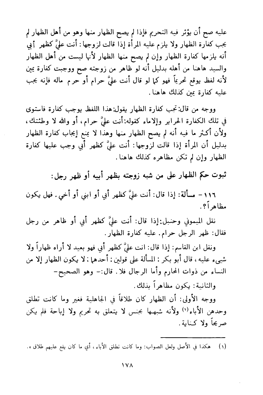 116 - مسألة: إذا قال: أنت عليَّ كظهر أبي أو ابني أو أخي. فهل يكون مظاهراً؟