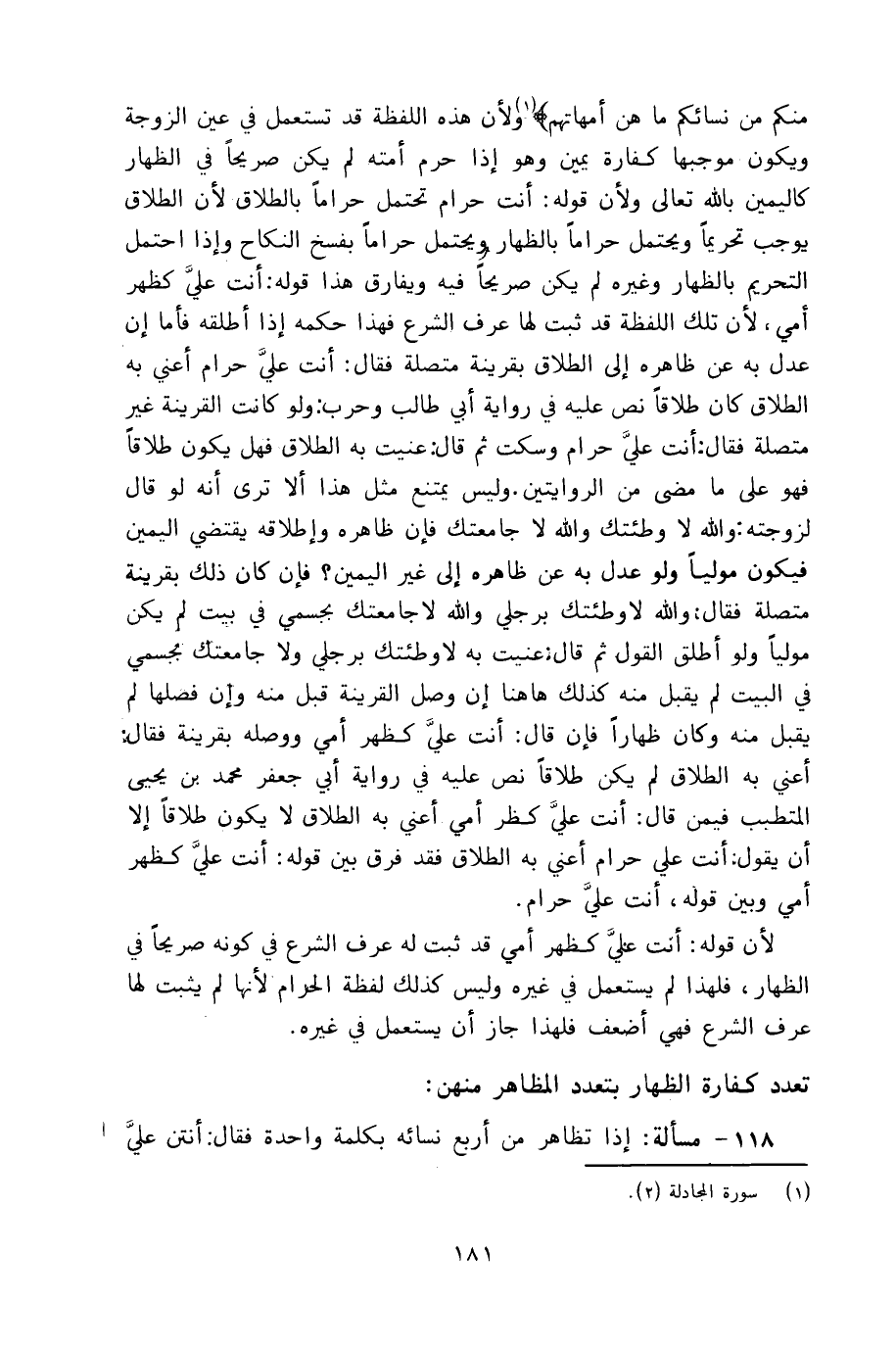 منكم من نسائكم ما هن أمهاتهم} ولأن هذه اللفظة قد تستعمل في عين الزوجة ويكون موجبها كفارة يمين وهو إذا حرم أمته لم يكن صريحاً في الظهار كاليمين بالله تعالى ولأن قوله: أنت حرام تحتمل حراماً بالطلاق لأن الطلاق يوجب تحريماً ويحتمل حراماً بالظهار ويحتمل حراماً بفسخ النكاح وإذا احتمل التحريم بالظهار وغيره لم يكن صريحاً فيه ويفارق هذا في قوله: أنت عليَّ كظهر أمي، لأن تلك اللفظة قد ثبت لها عرف الشرع فهذا حكمه إذا أطلقه فأما إن عدل به عن ظاهره إلى الطلاق بقرينة متصلة فقال: أنت عليَّ حرام أعني به الطلاق كان طلاقاً نص عليه في رواية أبي طالب وحرب: ولو كان القرينة غير متصلة فقال: أنت عليَّ حرام وسكت ثم قال: عنيت به الطلاق فهل يكون طلاقاً فهو على ما مضى من الروايتين: وليس يمتنع مثل هذا ألا ترى أنه لو قال لزوجته: والله لا وطئتك والله لا جامعتك فإن ظاهره وإطلاقه يقتضي اليمين فيكون مولياً ولو عدل به عن ظاهره إلى غير اليمين؟ فإن كان ذلك بقرينة متصلة فقال: والله لا وطئتك برجلي والله لا جامعتك بجسمي في بيت لم يكن مولياً ولو أطلق القول ثم قال: عنيت به لأوطئتك برجلي ولا جامعتك بجسمي في البيت لم يقبل منه كذلك هاهنا إن وصل القرينة قبل منه وإن فصلها لم يقبل منه وكان ظهاراً فإن قال: أنت عليَّ كظهر أمي ووصله بقرينة فقال: أعني به الطلاق لم يكن طلاقاً نص عليه في رواية أبي جعفر محمد بن يحيى المتطبب فيمن قال: أنت عليَّ كظهر أمي أعني به الطلاق لا يكون طلاقاً إلا أن يقول: أنت عليَّ حرام أعني به الطلاق فقد فرق بين قوله: أنت عليَّ كظهر أمي وبين قوله، أنت عليَّ حرام.