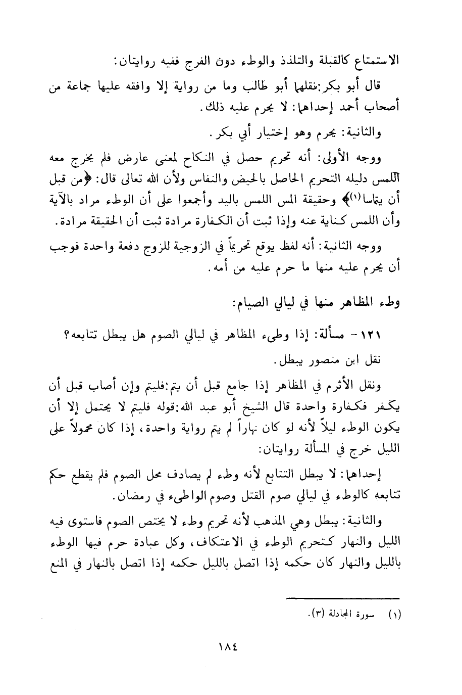 121 - مسألة: إذا وطىء المظاهر في ليالي الصوم هل يبطل تتابعه؟