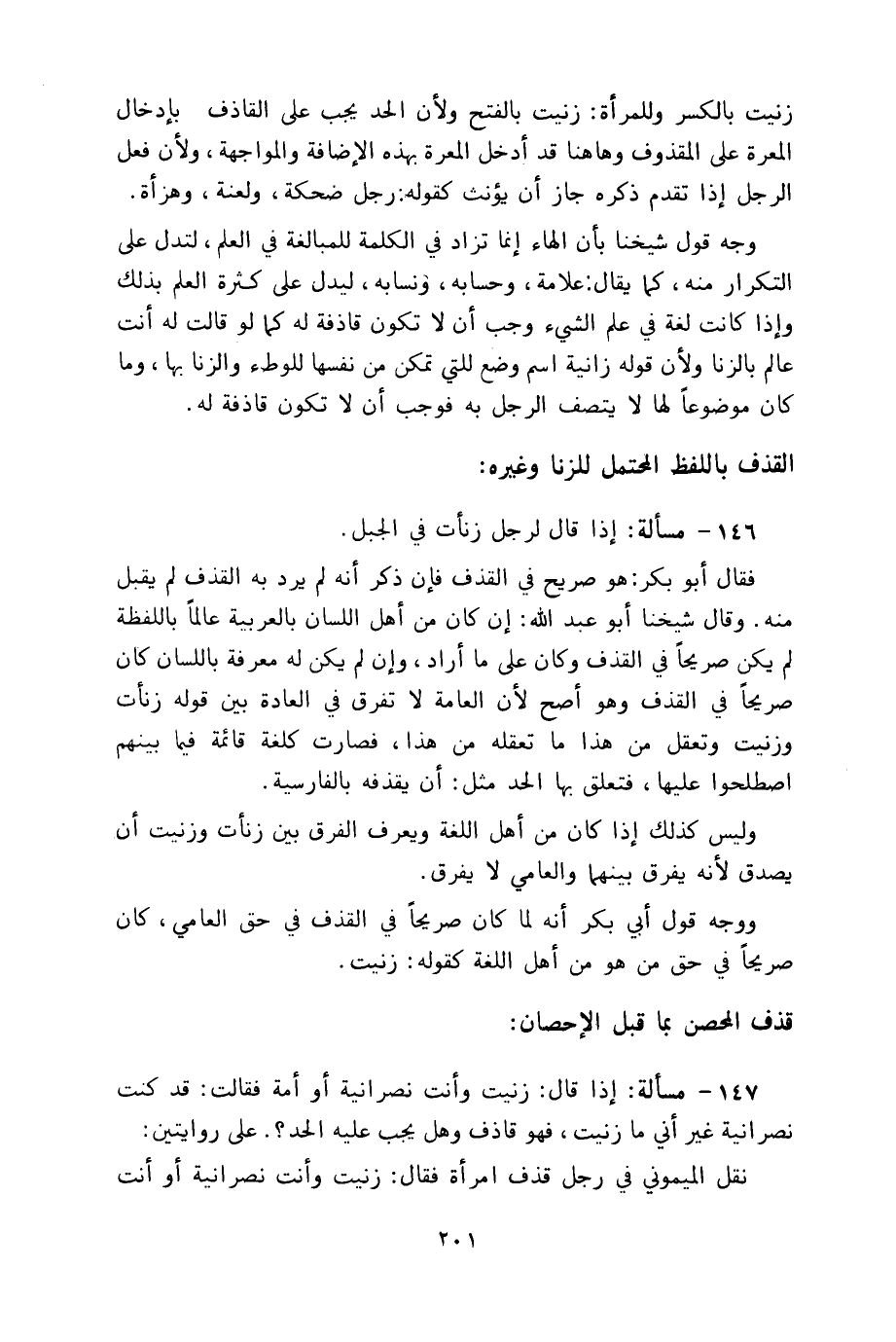 فقال أبو بكر: هو صريح في القذف فإن ذكر أنه لم يرد به القذف لم يقبل منه. وقال شيخنا أبو عبد الله: إن كان من أهل اللسان بالعربية عالماً باللفظة لم يكن صريحاً في القذف وكان على ما أراد، وإن لم يكن له معرفة باللسان وكان صريحاً في القذف وهوأصح لأن العامة لا تفرق في العادة بين قوله زنأت وزنيت وتعقل من ها ما تعقله من هذا، فصارت كلغة قائمة فيما بينهم اصطلحوا عليها، فتعلق بها الحد مثل: أن يقذفه بالفارسية.