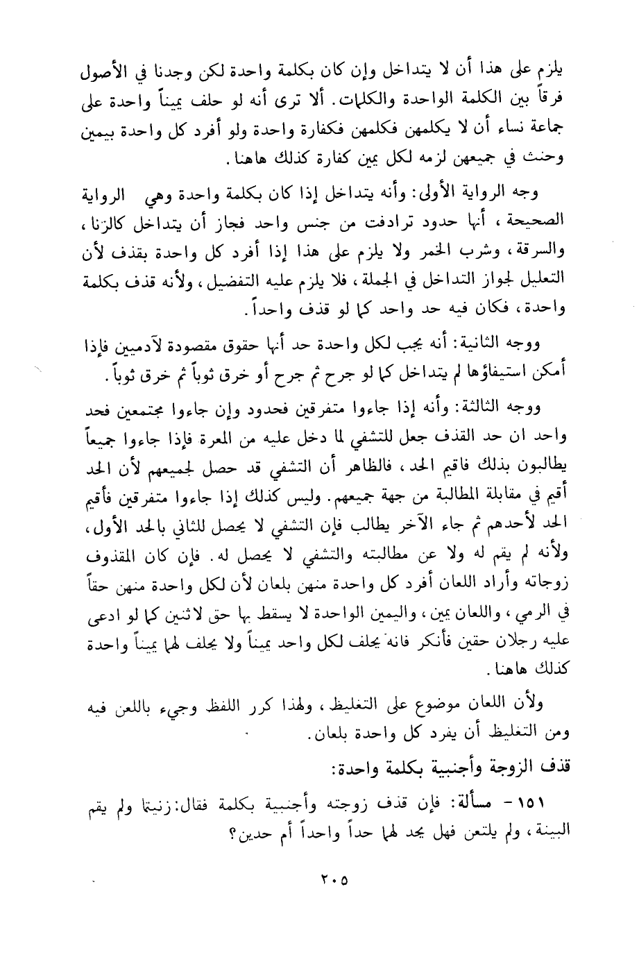 ووجه الثالثة: وأنه إذا جاؤوا متفرقين فحدود وإن جاؤوا مجتمعين فحد واحد أن حد القذف جعل للتشفي لما دخل عليه من المعرة فإذا جاؤوا جميعاً يطالبون بذلك فأقيم الحد، فالظاهر أن التشفي قد حصل لجميعهم لأن الحد أقيم في مقابلة المطالبة من جهة جميعهم. وليس كذلك إذا جاؤوا متفرقين فأقيم الحد لأحدهم ثم جاء الآخر يطالب فإن التشفي لا يحصل للثاني بالحد الأول ولأنه لم يقم له ولا عن مطالبته والتشفي لا يحصل له. فإن كان المقذوف زوجاته وأراد اللعان أفرد كل واحدة منهن بلعان لأن لكل واحدة منهن حقاً في الرمي، واللعان يمين، واليمين الواحدة لا يسقط بها حق لاثنين كما لو ادعى عليه رجلان حقين فأنكر فإنه يحلف لكل واحد يميناً ولا يحلف لهما يميناً واحدة كذلك هاهنا.