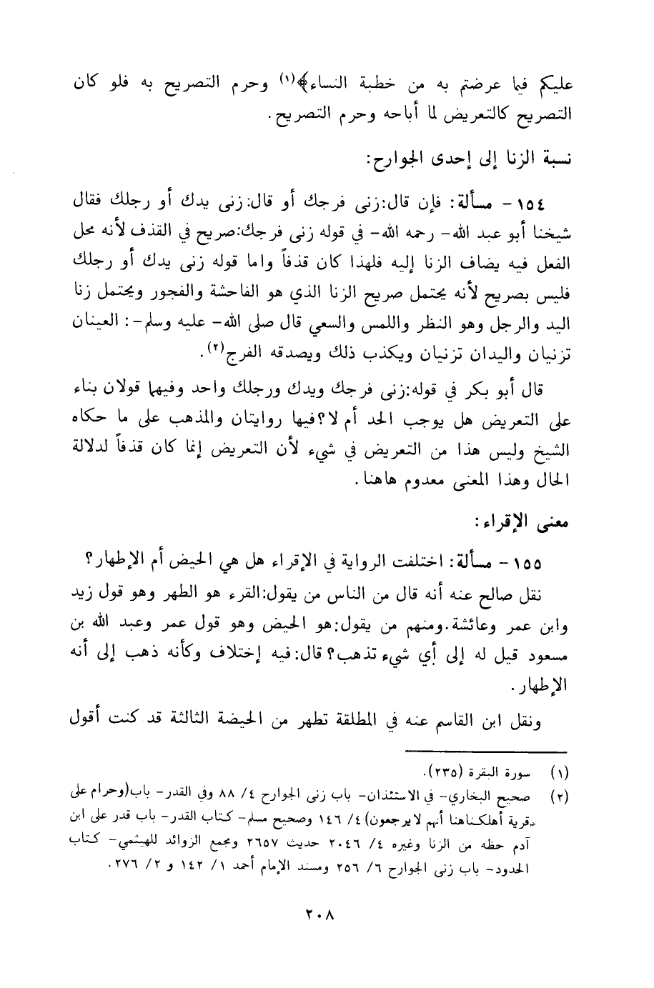 154 - مسألة: فإن قال: زنى فرجك أو قال: زنى يدك أو رجلك فقال شيخنا أبو عبد الله ـ رحمه الله ـ في قوله زنى فرجك: صريح في القذف لأنه محل الفعل فيه يضاف الزنا إليه فلهذا كان قذفاً وإما قوله زنى يدك أو رجلك فليس بصريح لأنه يحتمل صريح الزنا الذي هو الفاحشة والفجور ويحتمل زنا اليد والرجل وهو النظر واللمس والسعي قال: العينان تزينان واليدان تزنيان ويكذب ذلك ويصدقه الفرج.