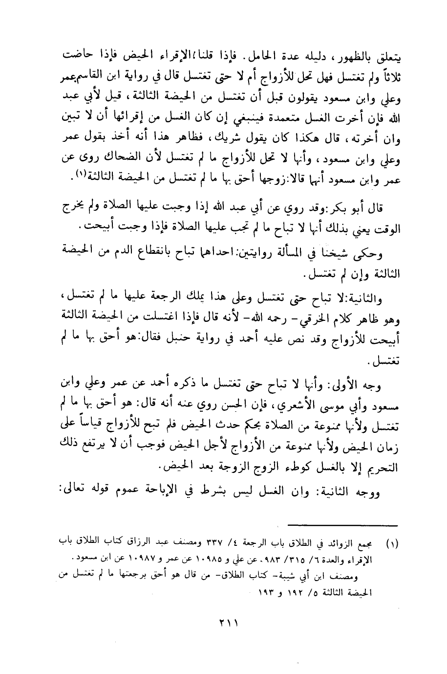 وجه الأولى: وأنها لا تباح حتى تغتسل ما ذكره أحمد عن عمر وعلي وابن مسعود وأبي موسى الأشعري، فإن الحسن روي عنه أنه قال: هو أحق بها ما لم تغتسل ولأنها ممنوعة من الصلاة بحكم حدث الحيض فلم تبح للأزواج قياساً على زمان الحيض ولأنها ممنوعة من الأزواج لأجل الحيض فوجب أن لا يرتفع ذلك التحريم إلا بالغسل كوطء الزوج الزوجة بعد الحيض.