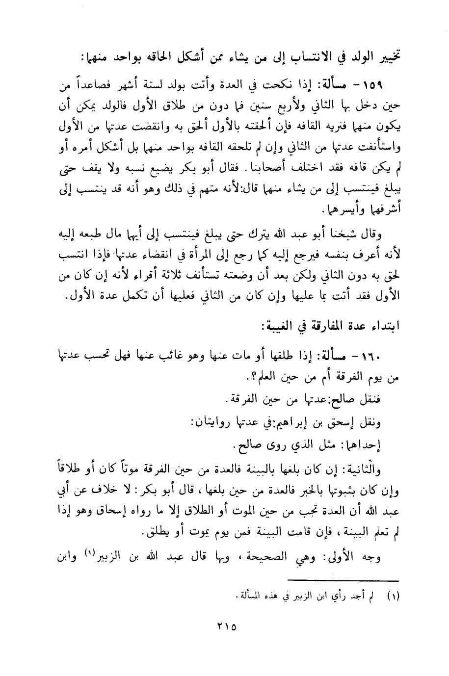 159 - مسألة: إذا نكحت في العدة وأتت بولد لستة أشهر فصاعداً من حين دخل بها الثاني ولأربع سنين فما دون من طلاق الأول فالولد يمكن أن يكون منهما فنريه القافه فإن ألحقته بالأول ألحق به وانقضت عدتها من الأول واستأنفت عدتها من الثاني وإن لم تلحقه القافه بواحد منهما بل أشكل أمره أو لم يكن قافه فقد اختلف أصحابنا. فقال أبو بكر يضيع نسبه ولا يقف حتى يبلغ فينتسب إلى من يشاء منهما قال: لأنه متهم في ذلك وهو أنه قد ينتسب إلى أشرفهما وأيسرهما.