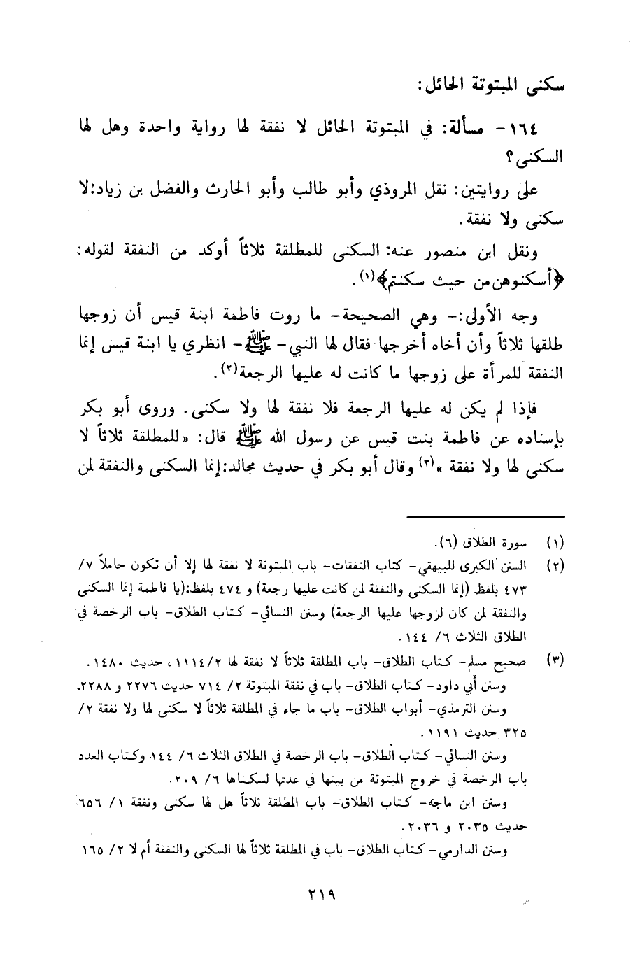 164 - مسألة: في المبتوتة الحائل لا نفقة لها رواية واحدة وهل لها السكنى؟