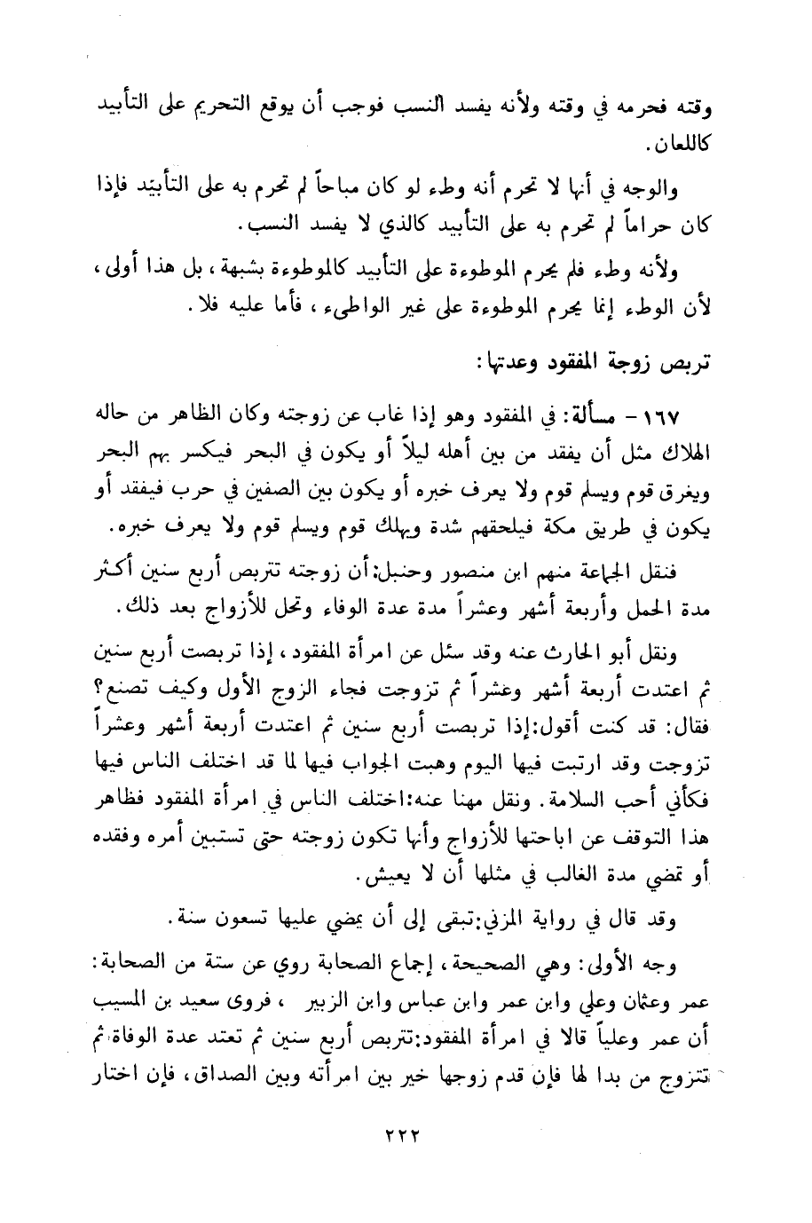 167 - مسألة: في المفقود وهو إذا غاب عن زوجته وكان الظاهر من حاله الهلاك مثل أن يفقد من بين أهله ليلاً ويكون في البحر فيكسر بهم البحر ويغرق قوم ويسلم قوم ولا يعرف خبره أو يكون بين الصفين في حرب فيفقد أو يكون في طريق مكة فيلحقهم شدة ويهلك قوم ويسلم قوم ولا يعرف خبره.