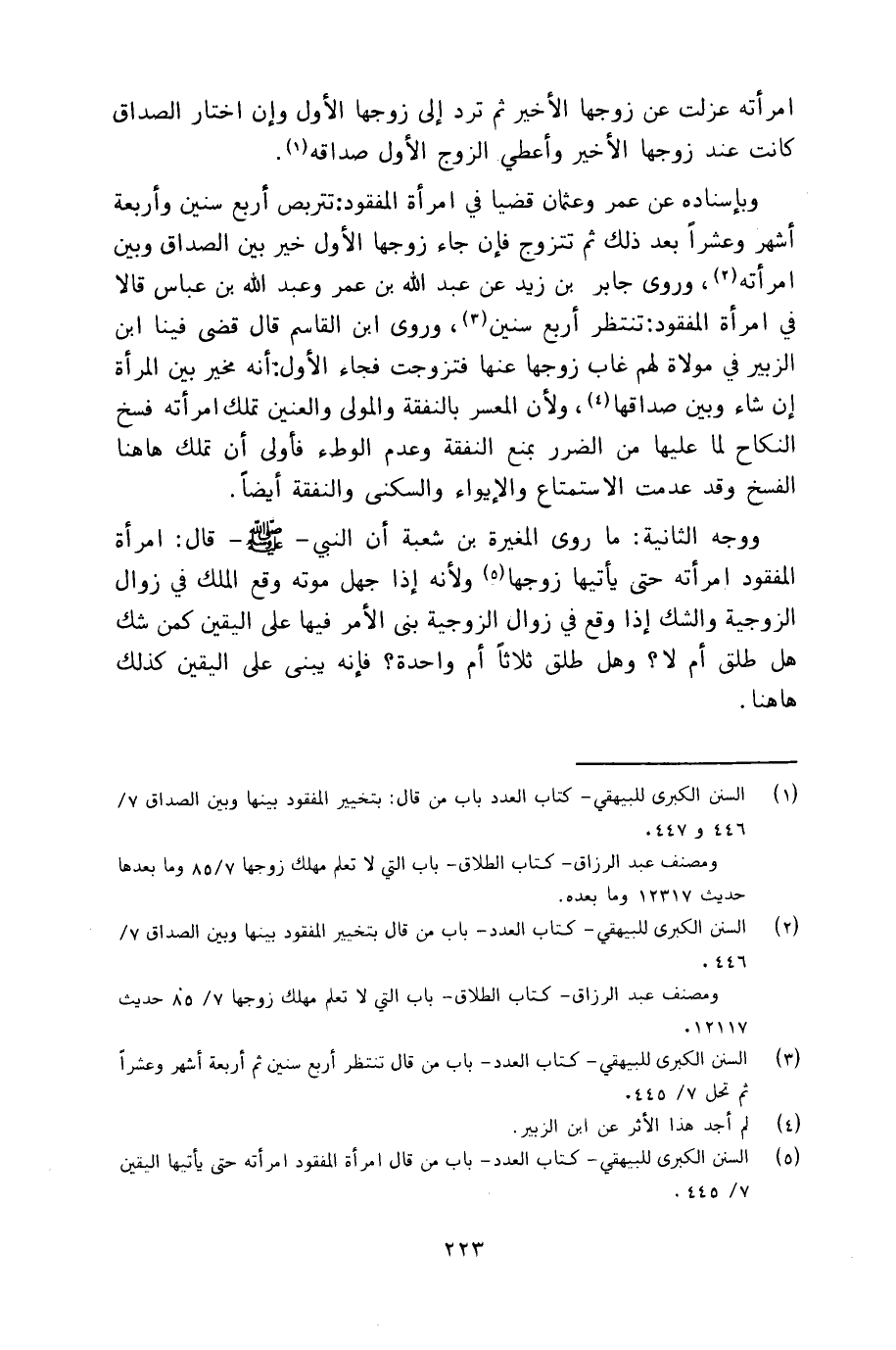 ووجه الثانية: ما روى المغيرة بن شعبة أن ـ النبي صلى الله عليه وسلم ـ قال: امرأة المفقود امرأته حتى يأتيها زوجها ولأنه إذا جهل موته وقع الملك في زوال الزوجية والشك إذا وقع في زوال الزوجية بنى الأمر فيها على اليقين كما شك هل طلق أم لا؟ وهل طلق ثلاثاً أم واحدة؟ فإنه يبنى على اليقين كذلك هاهنا.