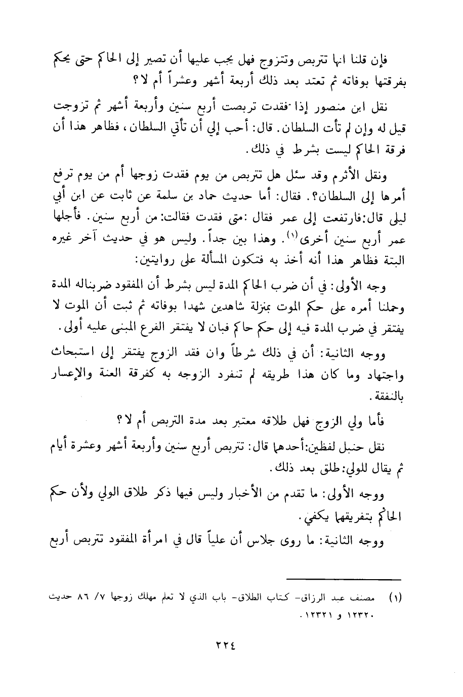 نقل ابن منصور إذا فقدت تربصت أربع سنين وأربعة أشهر ثم تزوجت قيل له وإن لم تأتِ السلطان. قال: أحب إليَّ أن تأتي السلطان، فظاهر هذا أن فرقة الحاكم ليست بشرط في ذلك.