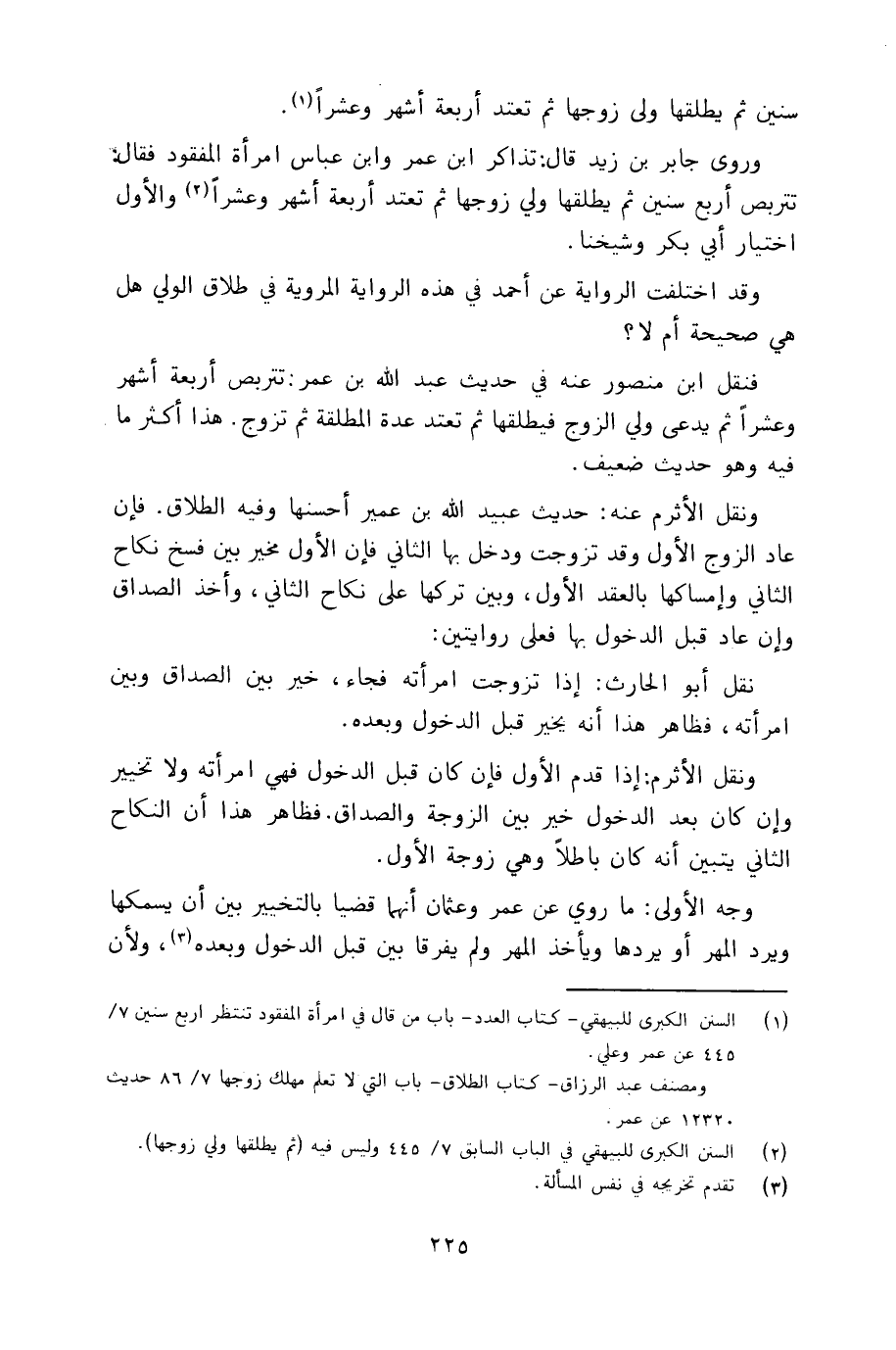 فنقل ابن منصور عنه في حديث عبد الله بن عمر: تتربص أربعة أشهر وعشراً ثم يدعى ولي الزوج فيطلقها ثم تعتد عدة المطلقة ثم تزوج. هذا أكثر ما فيه وهو حديث ضعيف.