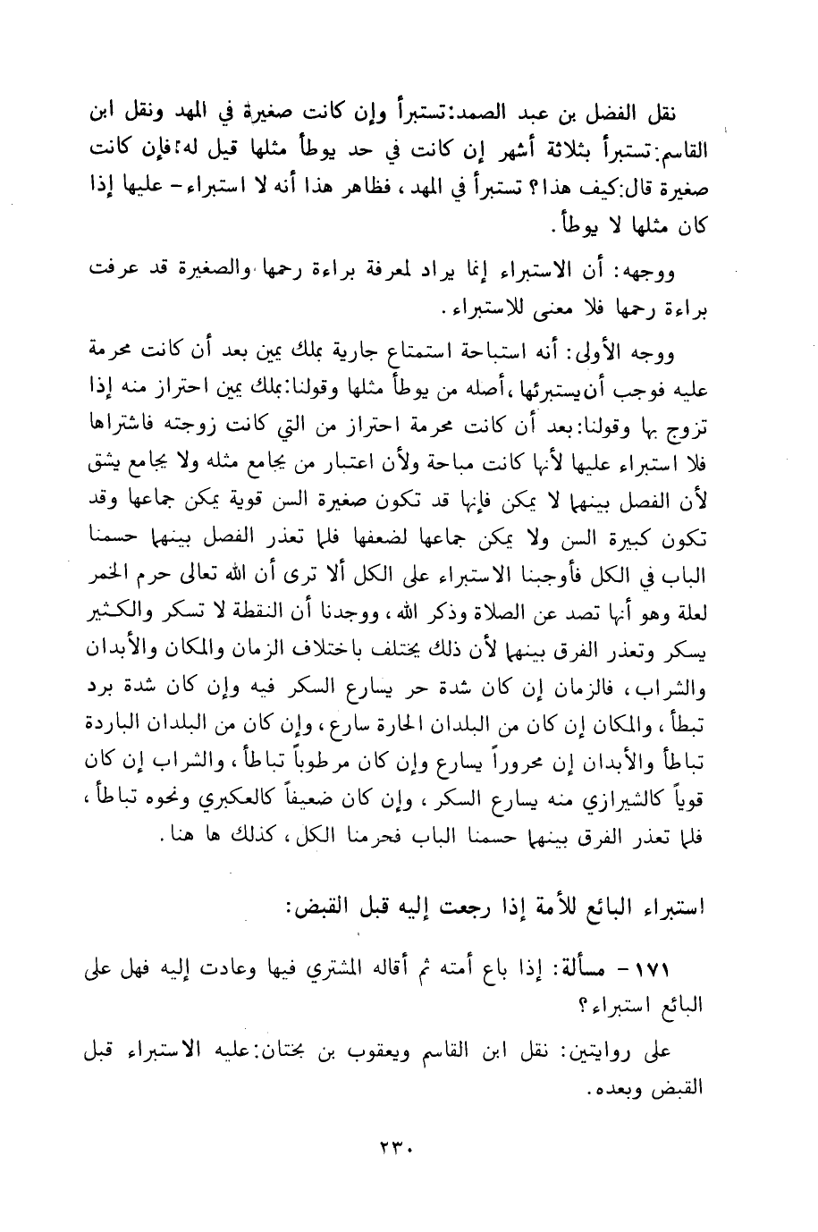 171 - مسألة: إذا باع أمته ثم أقاله المشتري فيها وعادت إليه فهل على البائع استبراء؟