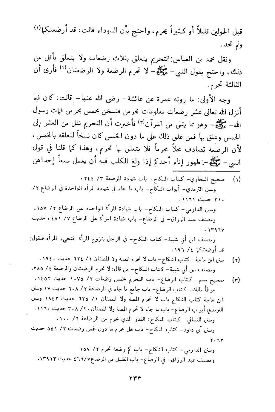 ونقل محمد بن العباس: التحريم يتعلق بثلاث رضعات ولا يتعلق بأقل من ذلك، واحتج بقول ـ النبي صلى الله عليه وسلم ـ لا تحرم الرضعة ولا الرضعتان فأرى أن الثالثة تحرم.