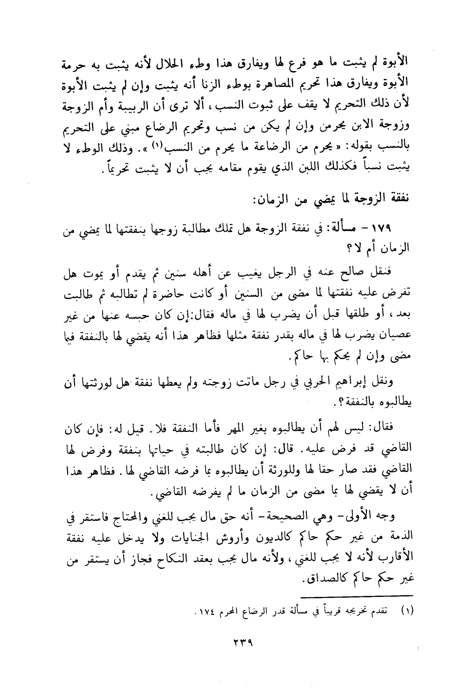 179 - مسألة: في نفقة الزوجة هل تملك مطالبة زوجها بنفقتها لما يمضي من الزمان أم لا؟
