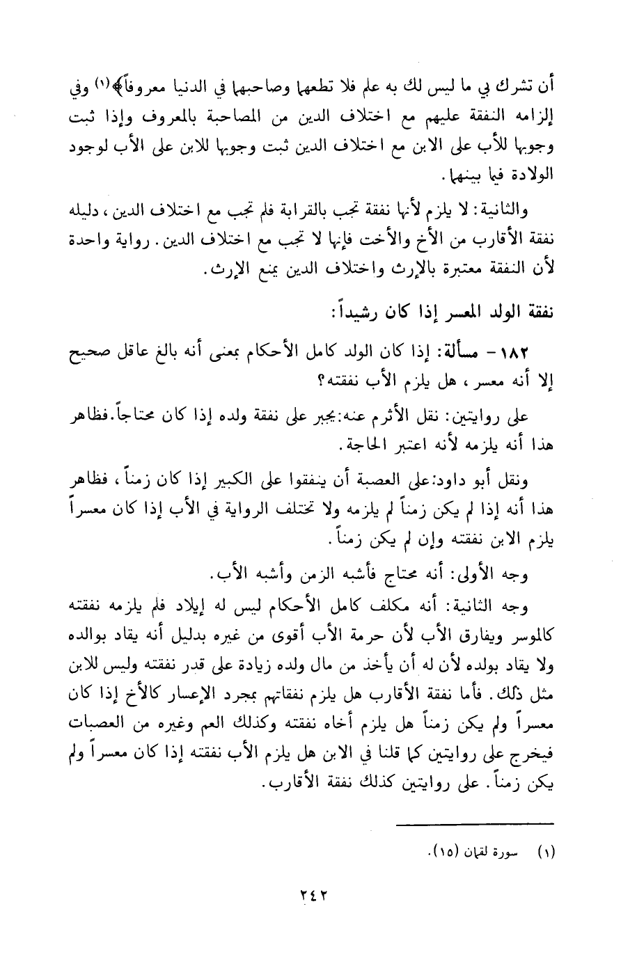 182 - مسألة: إذا كان الولد كامل الأحكام بمعنى أنه بالغ عاقل صحيح إلا أنه معسر، هل يلزم الأب نفقته؟